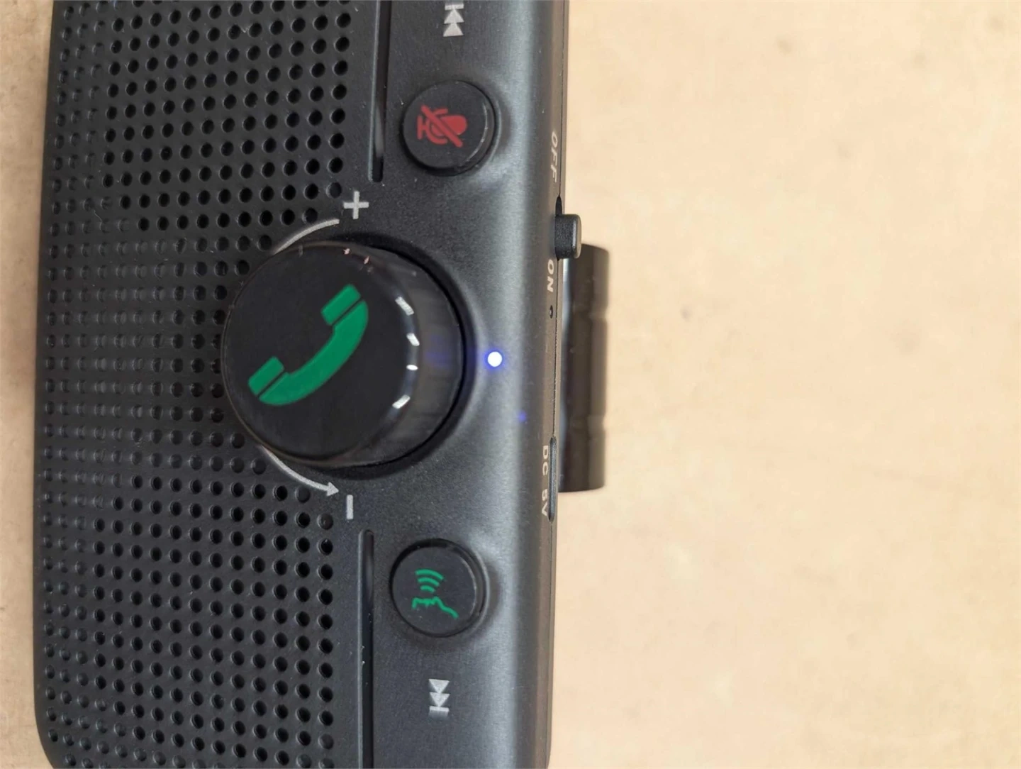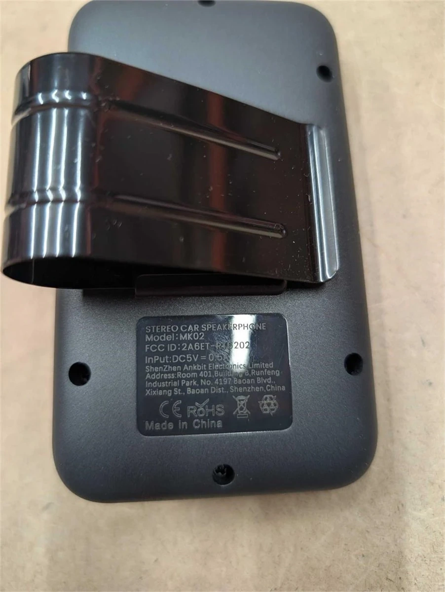 This is a 1Mii Stereo Car Speakerphone, model MK02. It's a hands-free device for your car. It includes a clip, USB-C cable, and USB-A cable for charging and connection.