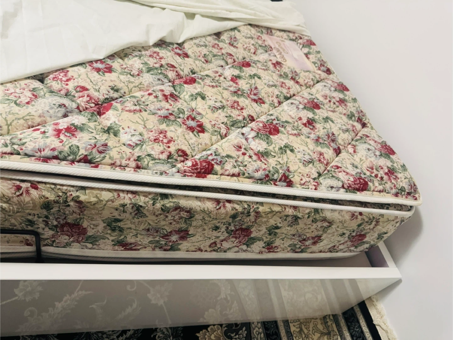 Selling a mattress with a floral pattern. It's in good condition and ready to be used in your home. Perfect for a guest room or a spare bed!