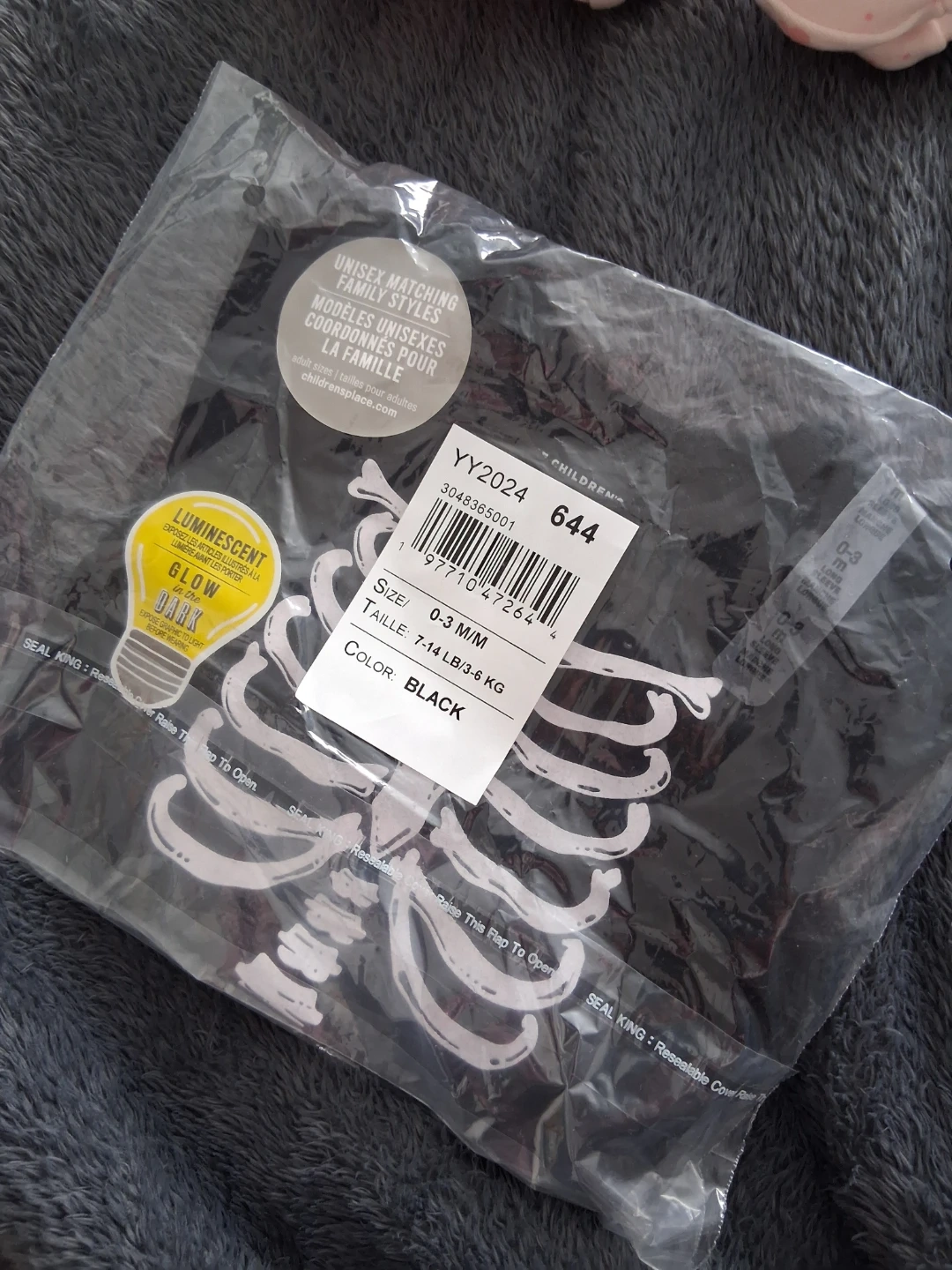 This Children's Place onesie is black and features a skeleton design that glows in the dark! It's size 0-3 months, suitable for 7-14 lbs or 3-6 kg. It's a unisex style for matching family looks.