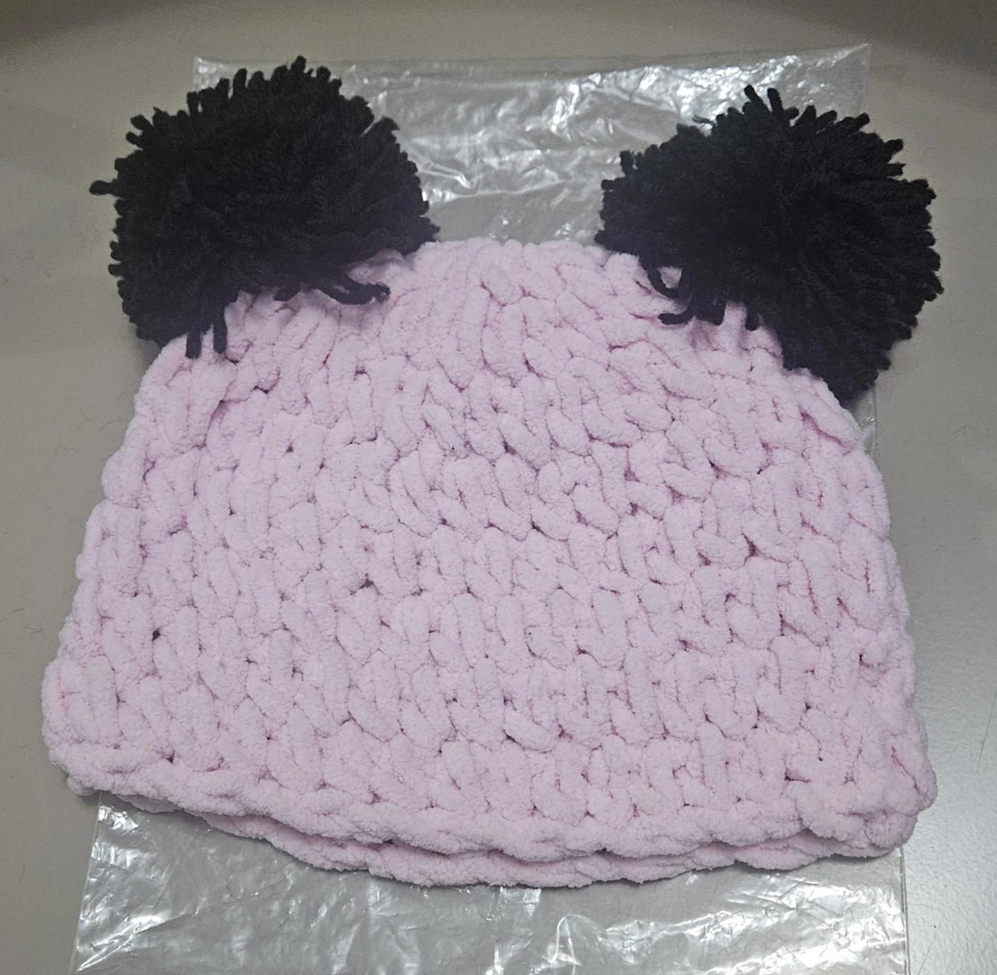 A cute, chunky knit hat in a soft pink color. It's adorned with two fluffy black pom-poms on top. This hat is perfect for keeping warm during cooler weather!