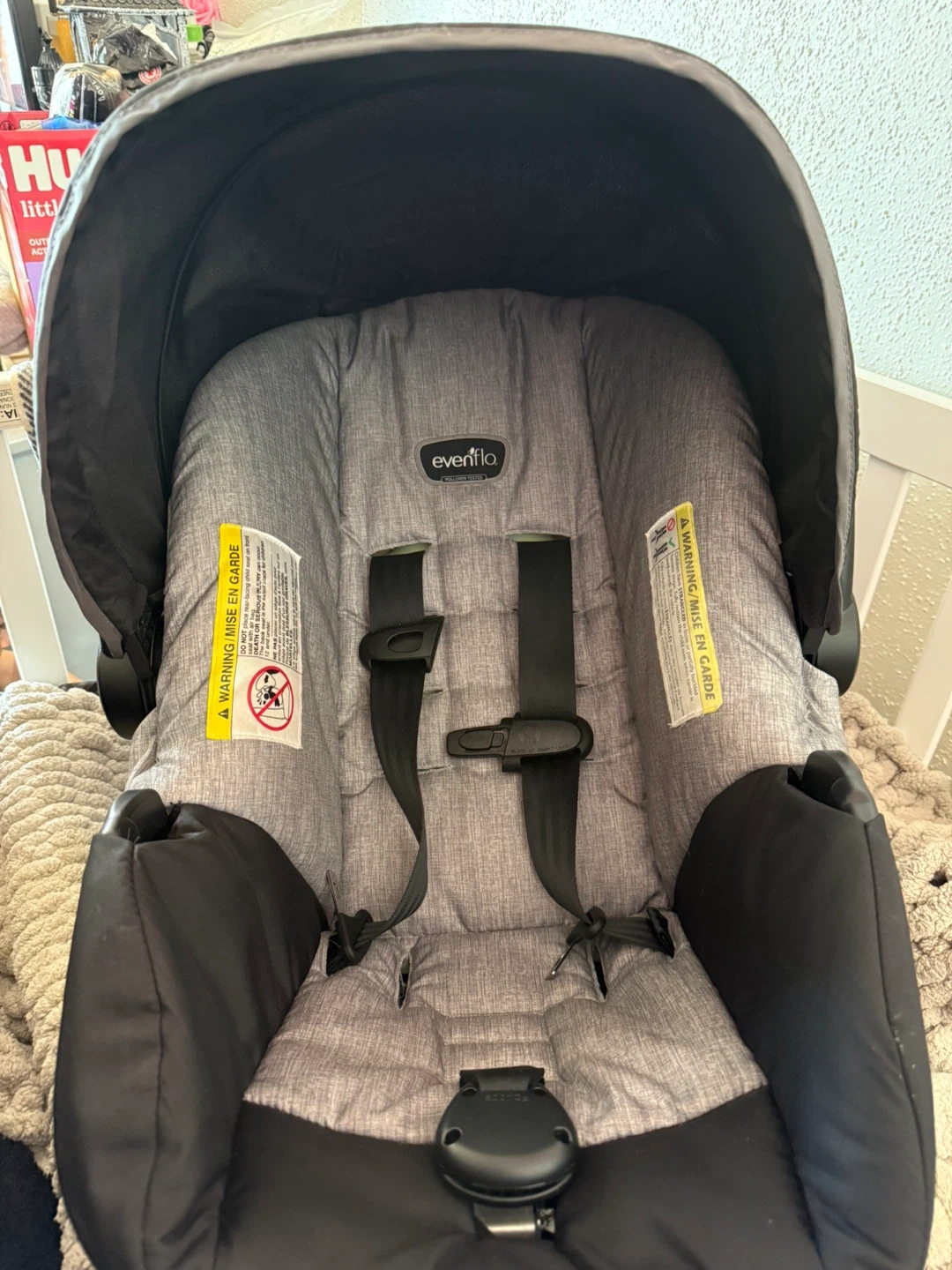 Grey and black infant car seat from Evenflo. This seat is suitable for infants and is used. The hood is manageable it just got bent a bit so it’s wonky sometimes. Trying to get it out of the way to move!