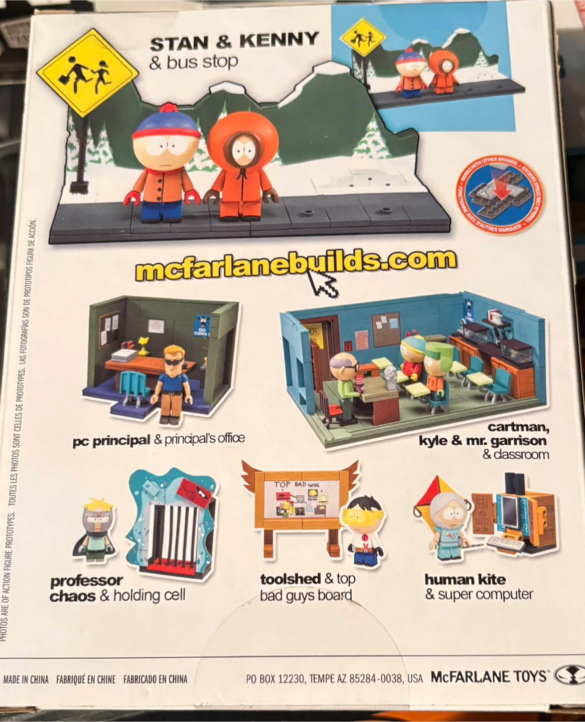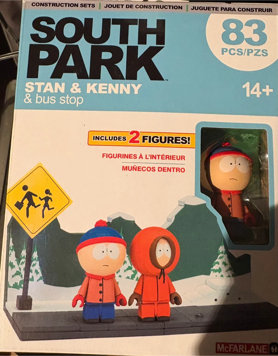 This McFarlane Toys South Park construction set includes Stan and Kenny figures with a bus stop accessory. It has 83 pieces and is recommended for ages 14+. It's a great addition for any South Park fan!