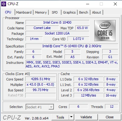 CPU : Intel(R) Core(TM) i5-10400 CPU @ 2.90 ~ 4.3GHz
