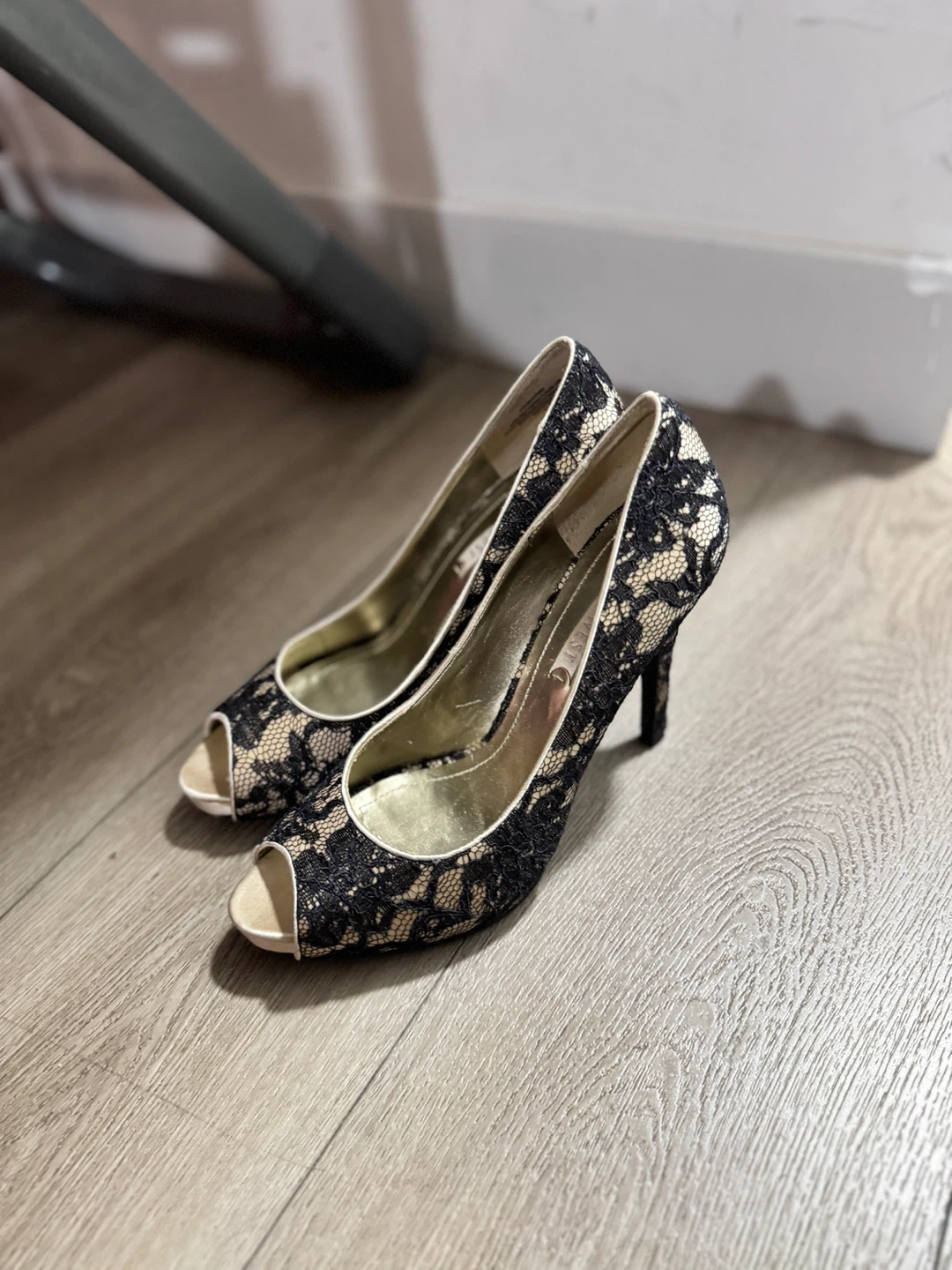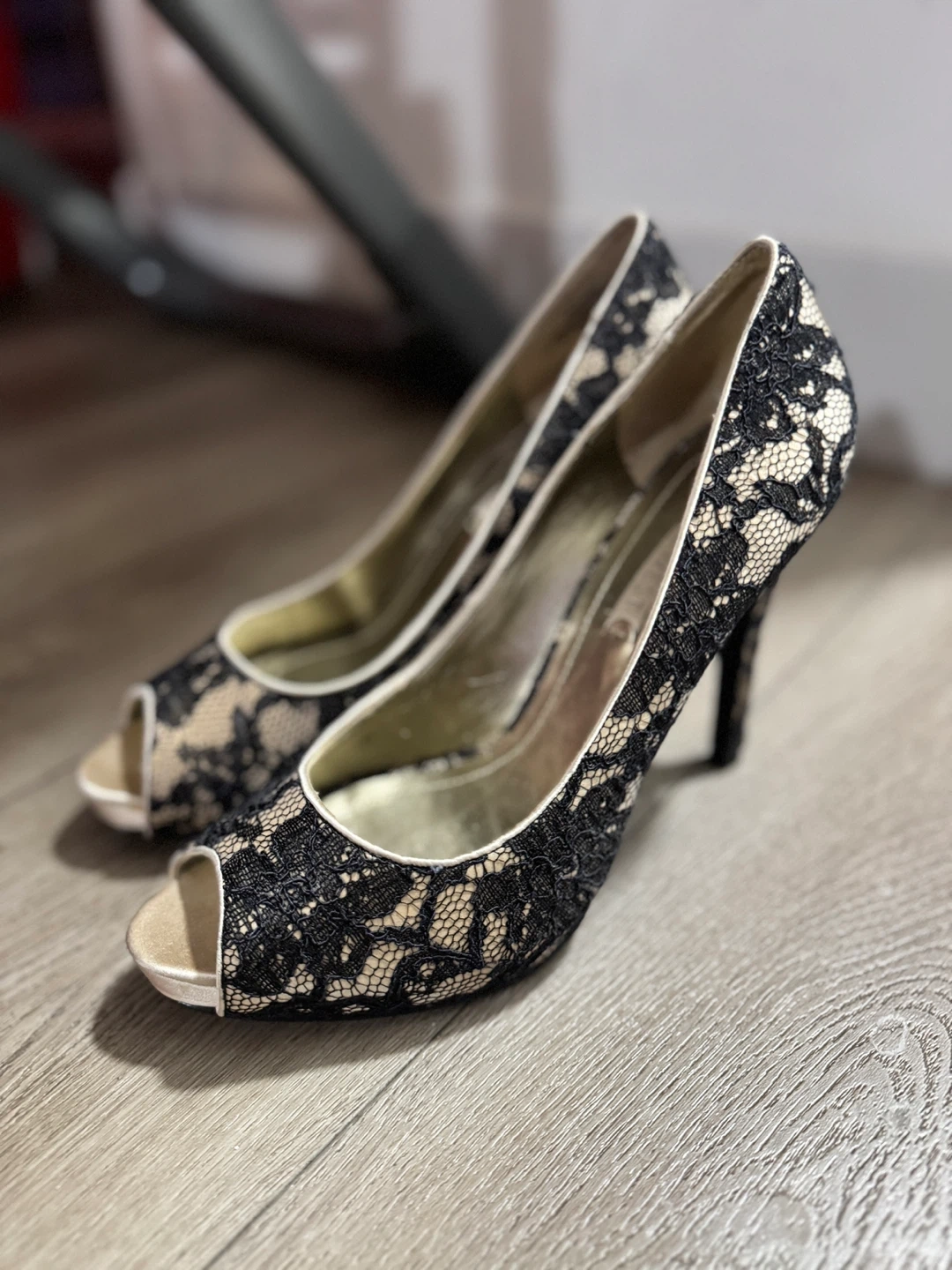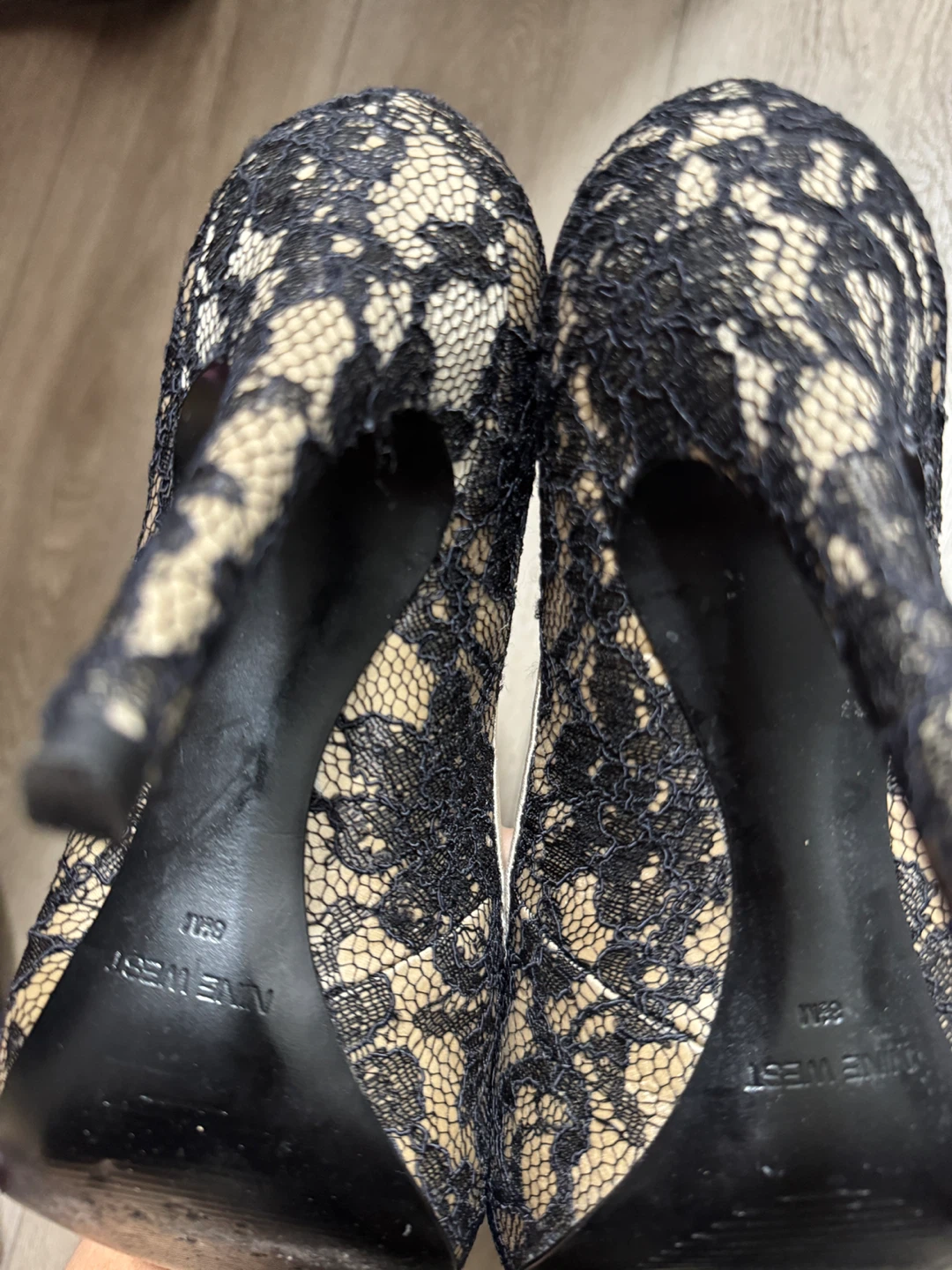 Here are some Nine West heels in a size 8.5! They have a unique black lace design over a light neutral colour. Perfect for dressing up an outfit!