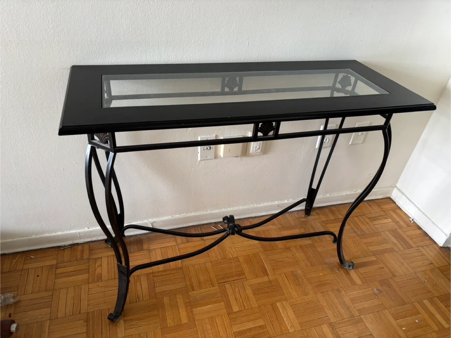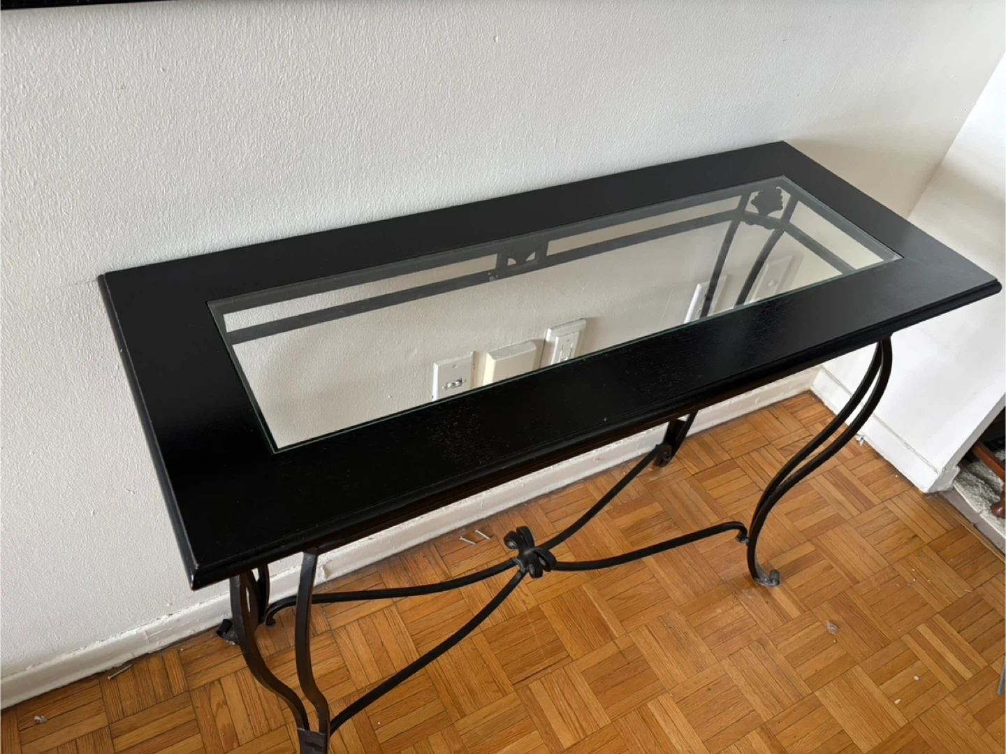 Selling a stylish black console table with a glass top. It's in great condition and would look lovely in an entryway or living room. The sleek design and sturdy construction make it a functional and attractive piece of furniture for any home.