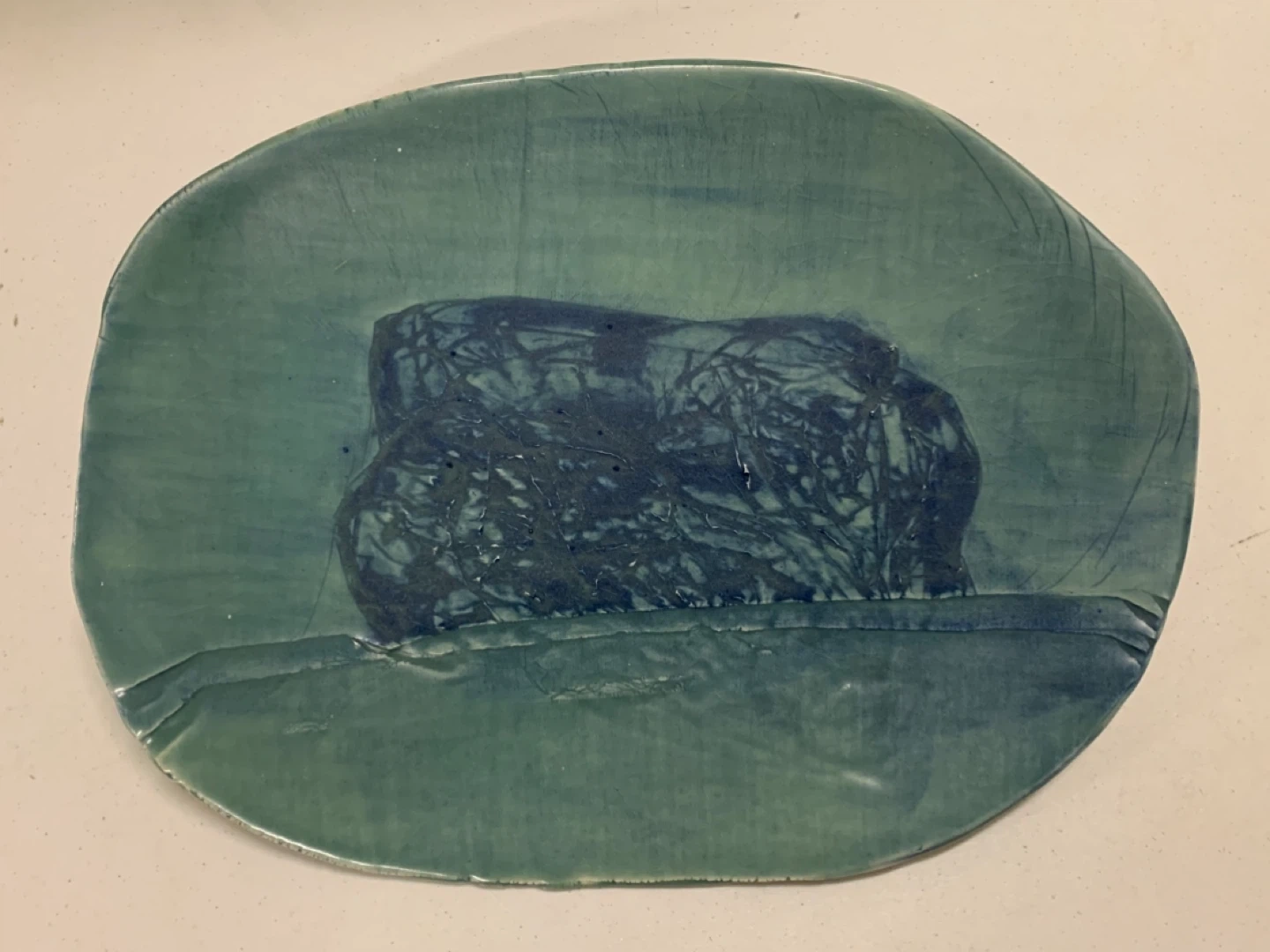 Selling a unique handmade decorative plate! It features a lovely green colour with a dark blue design in the centre. Perfect for adding a touch of artistry to your home decor