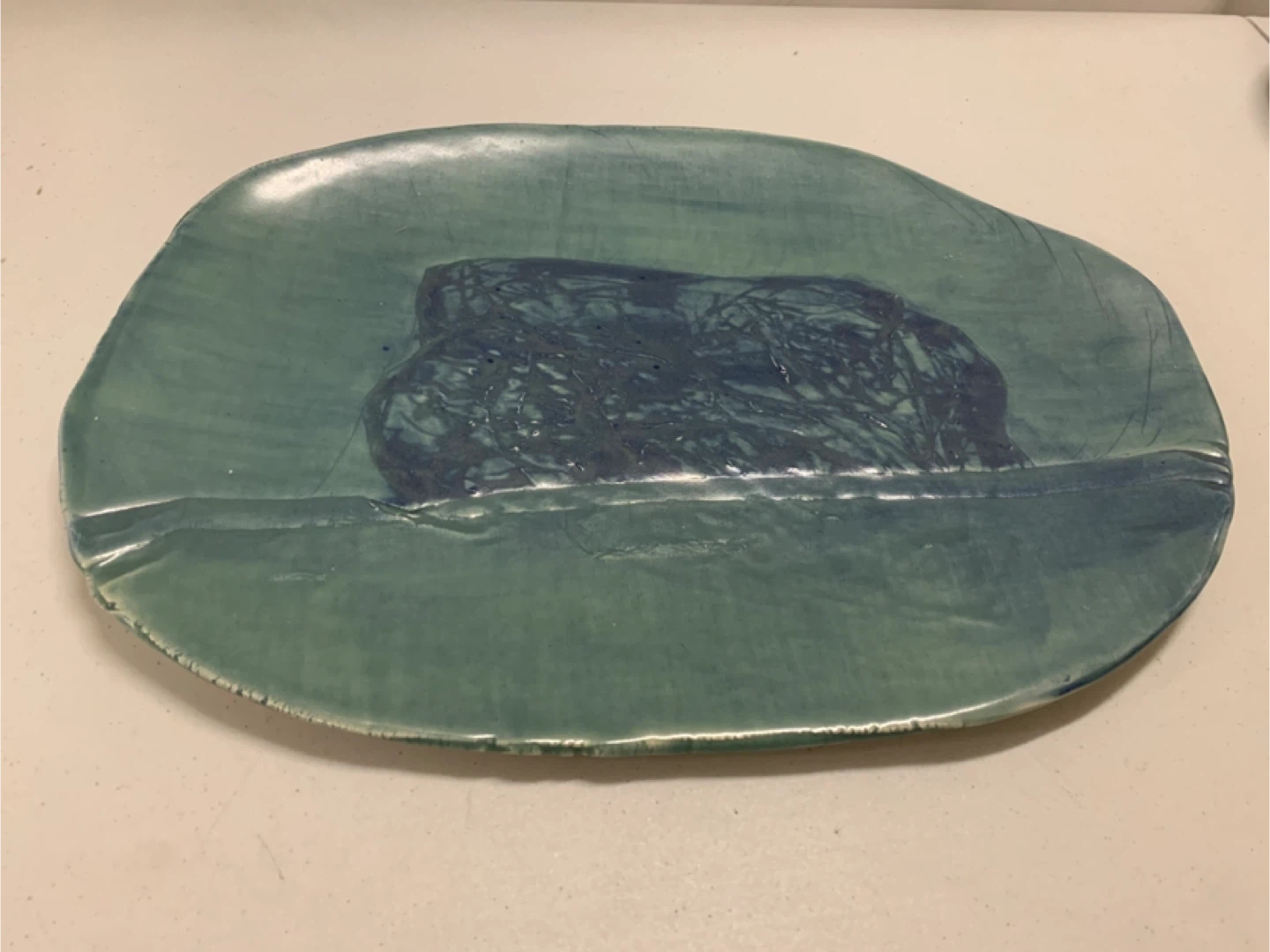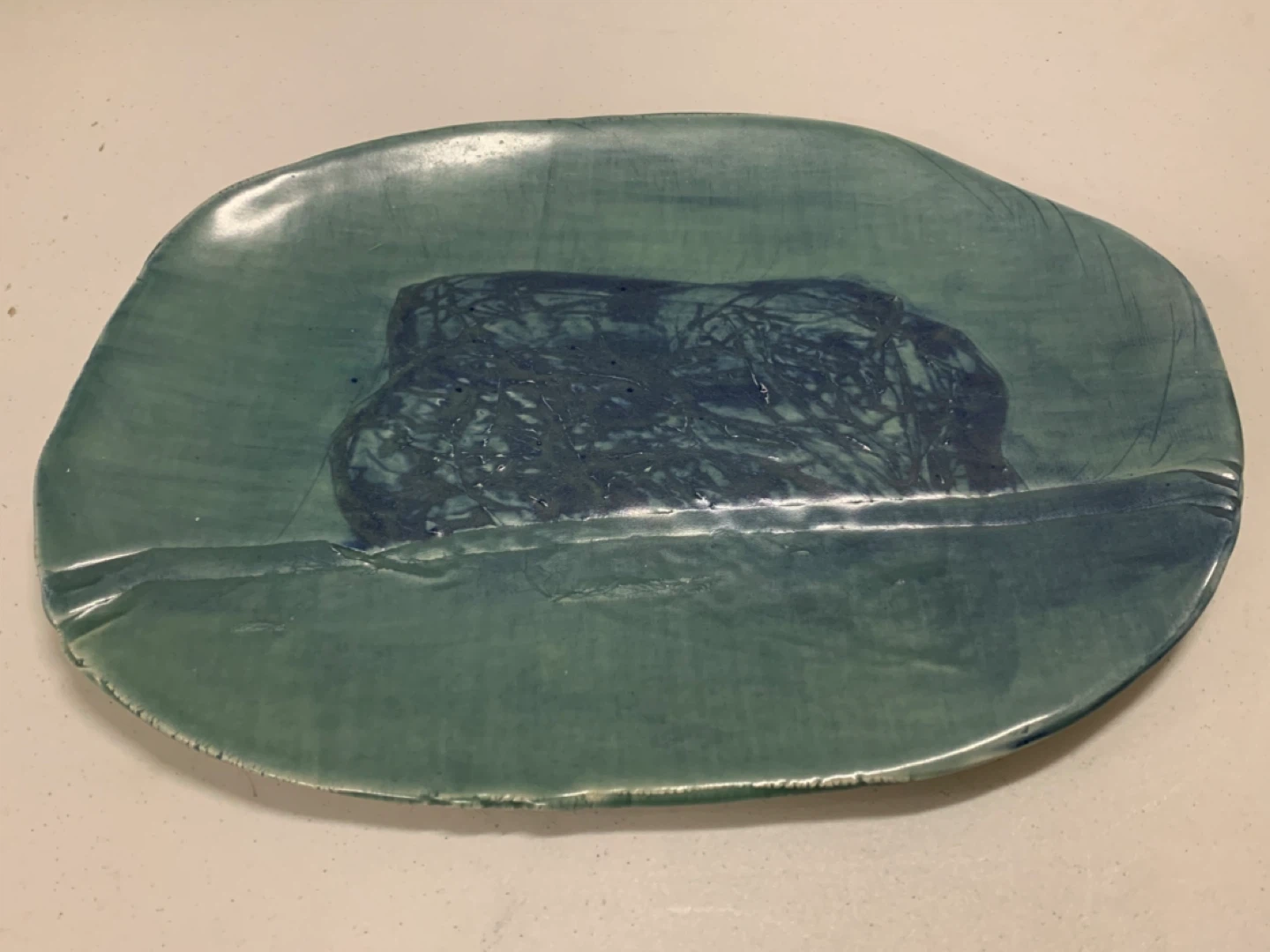 Selling a unique handmade decorative plate! It features a lovely green colour with a dark blue design in the centre. Perfect for adding a touch of artistry to your home decor