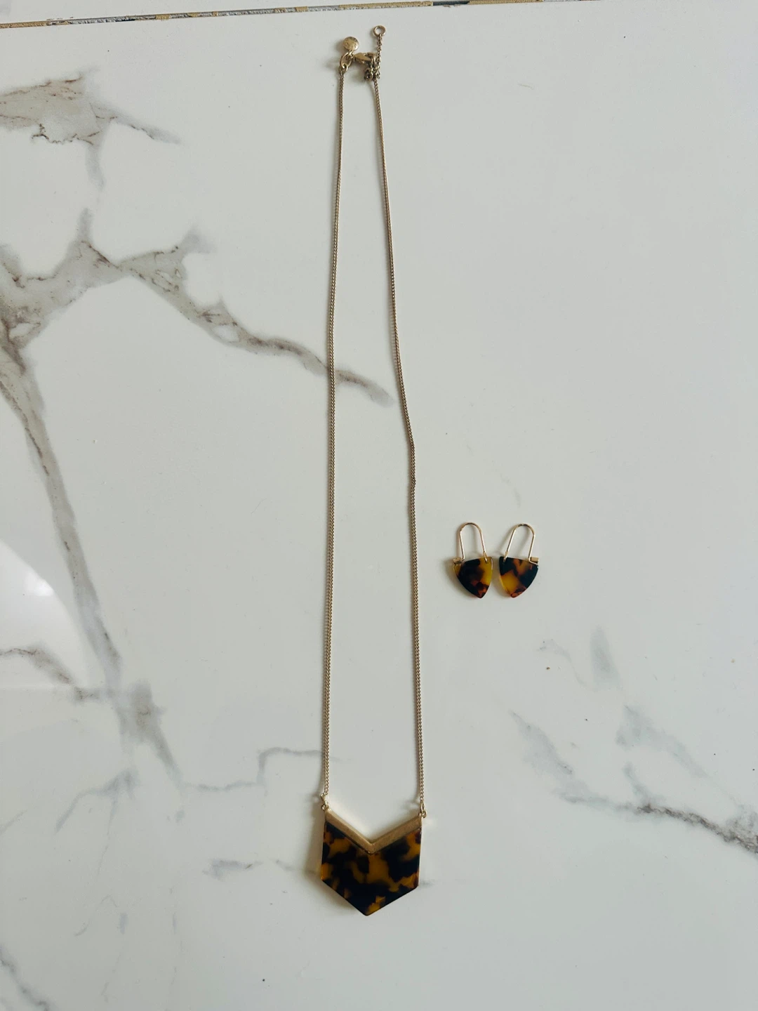 Selling a cute necklace and earring set! The necklace has a gold chain with a tortoise-shell coloured pendant, and the earrings are matching. Great for dressing up any outfit!