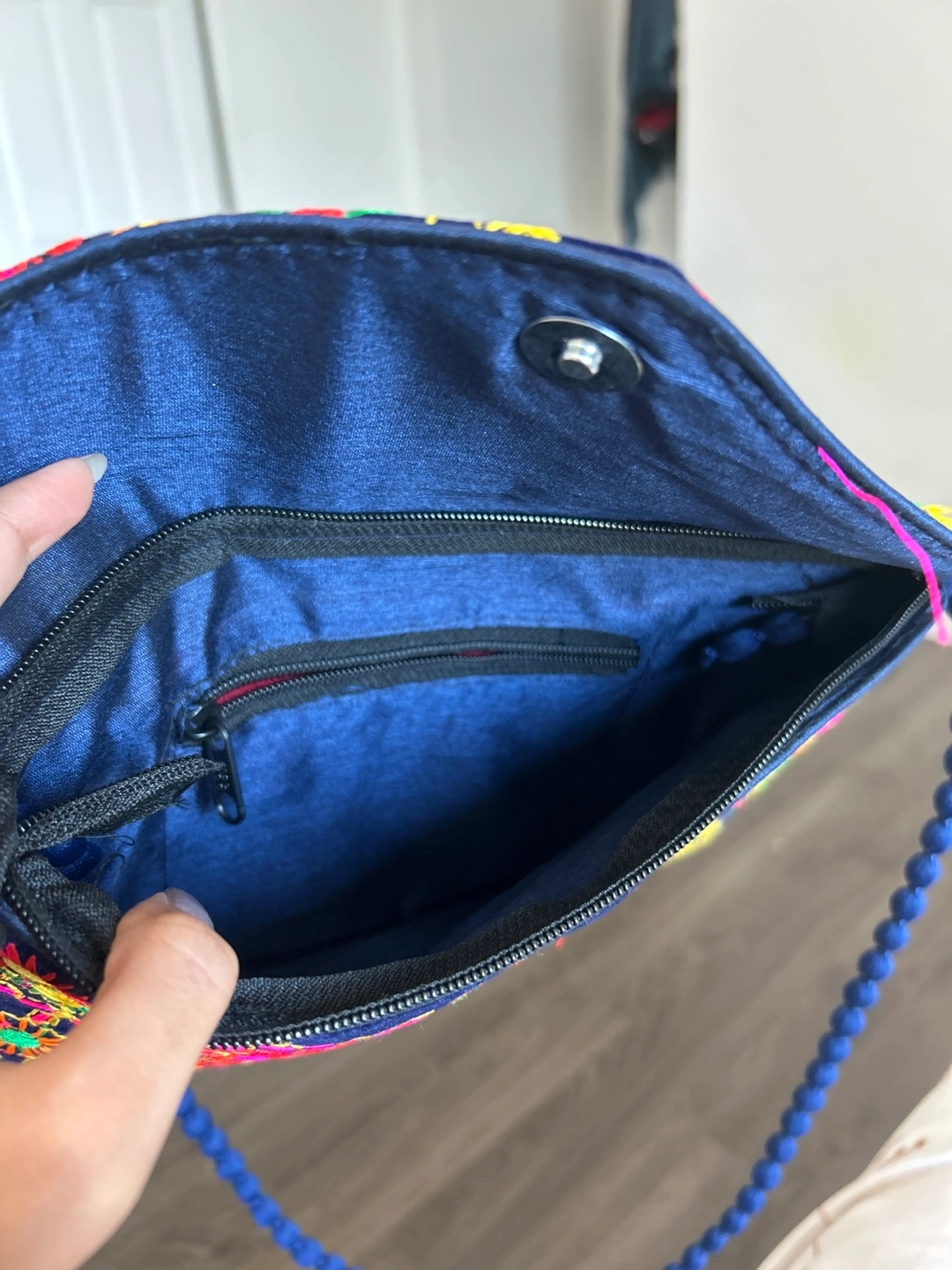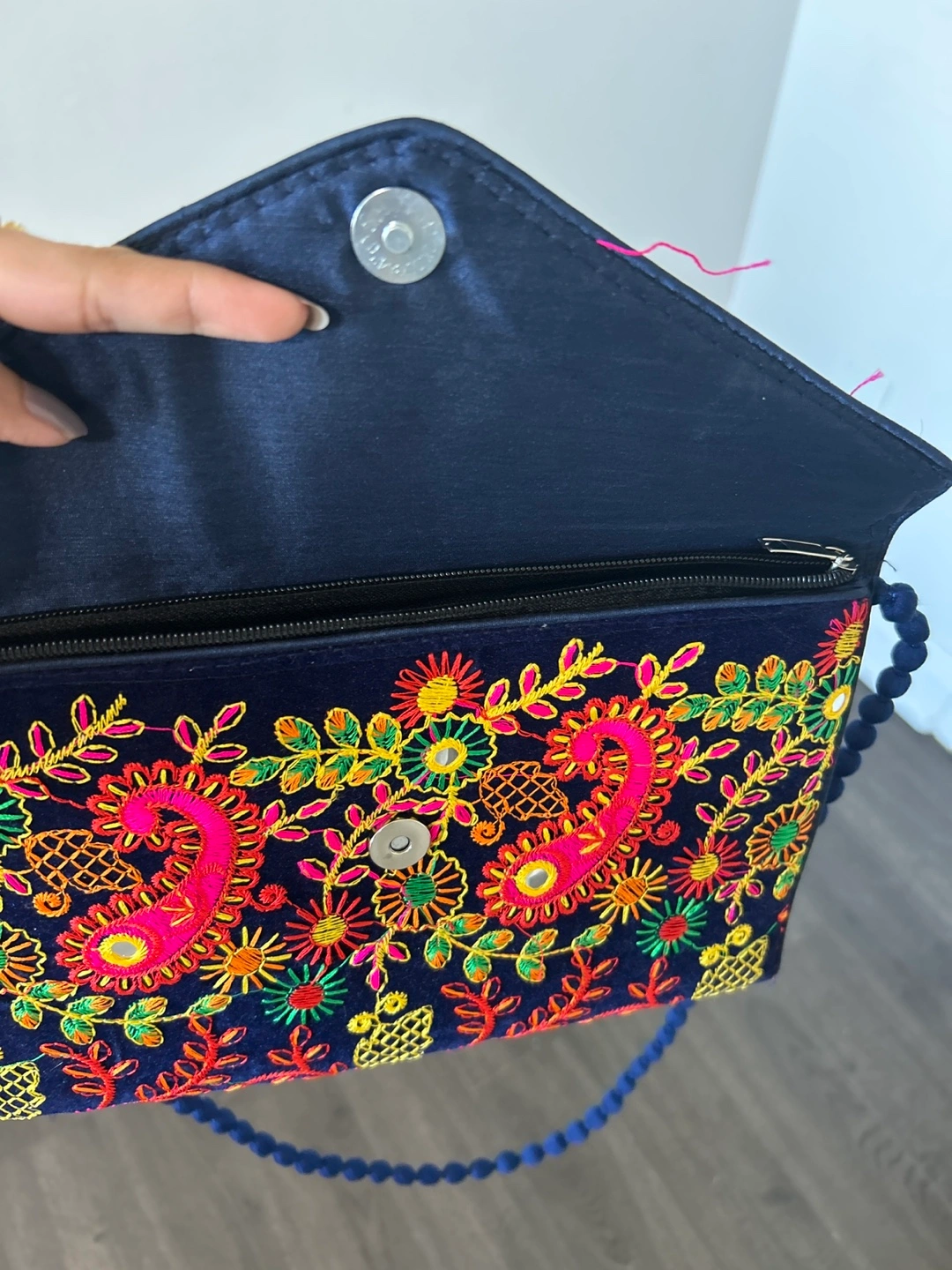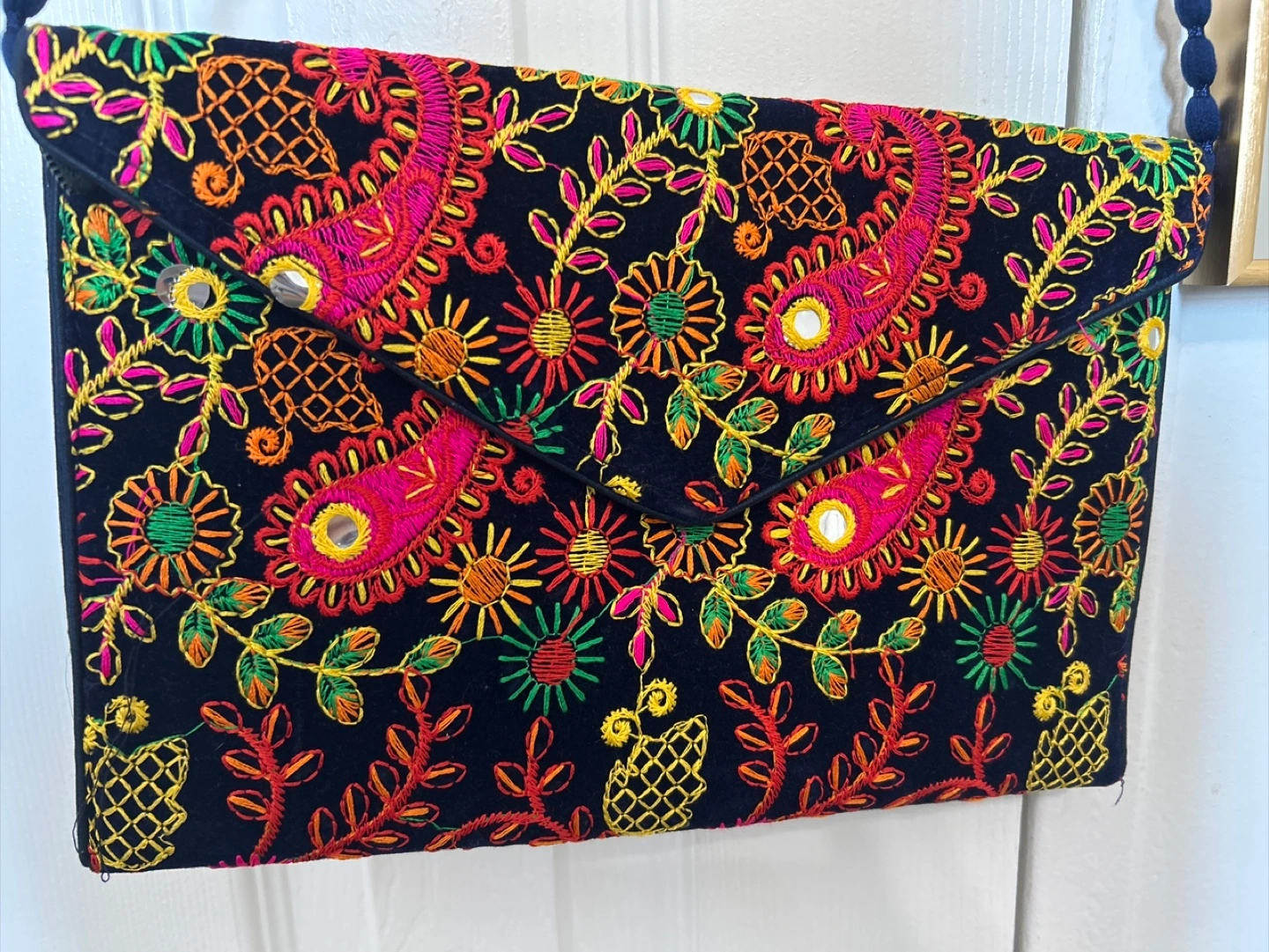 This clutch is a beautiful piece with colourful embroidery and a unique design. It's in great condition and has a convenient interior zipper pocket. Perfect for adding a pop of colour to any outfit!