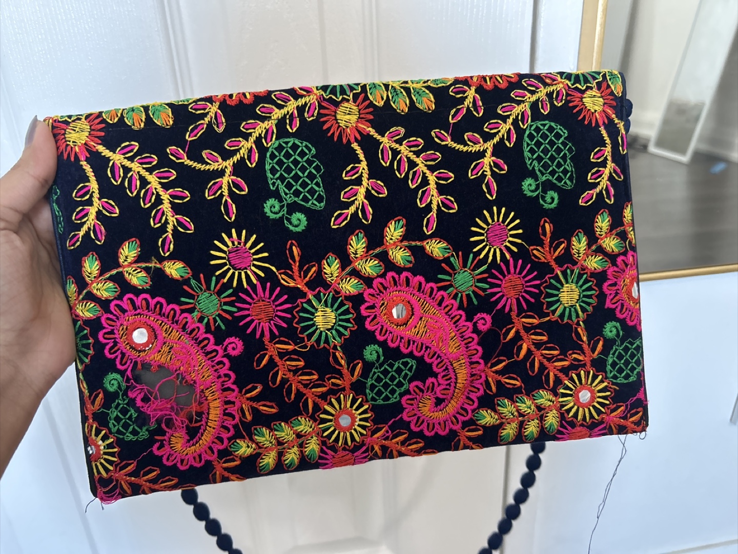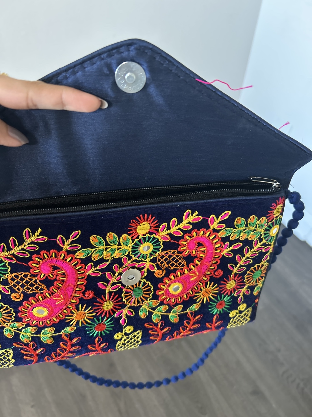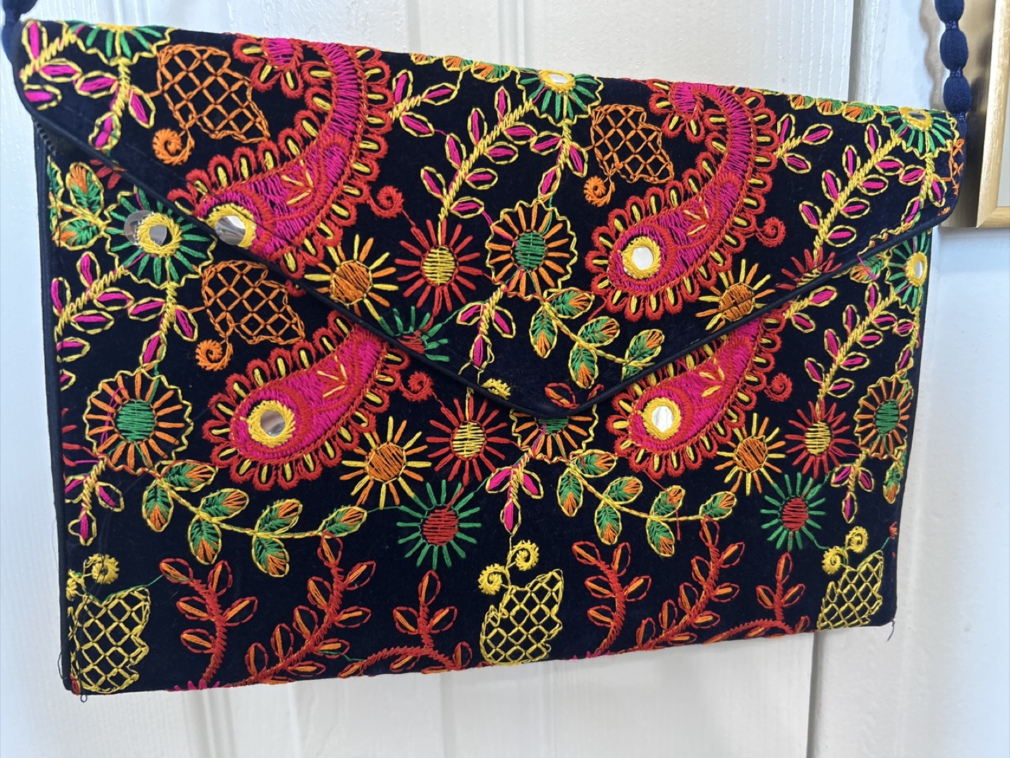 This clutch is a beautiful piece with colourful embroidery and a unique design. It's in great condition and has a convenient interior zipper pocket. Perfect for adding a pop of colour to any outfit!