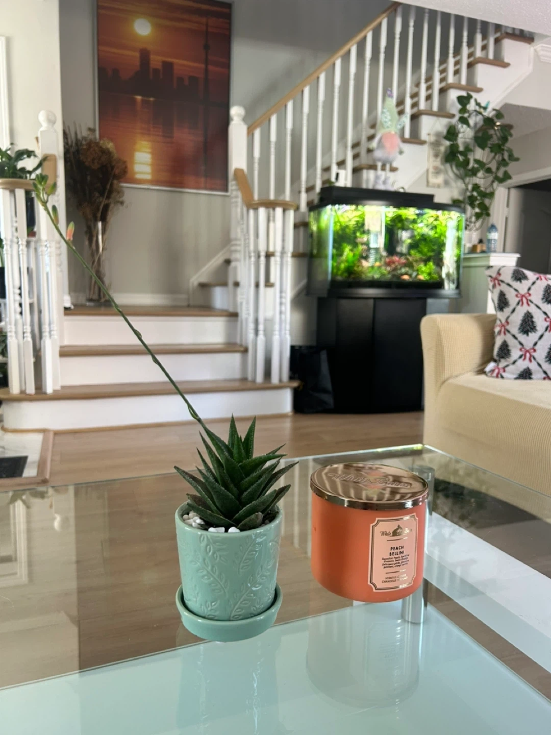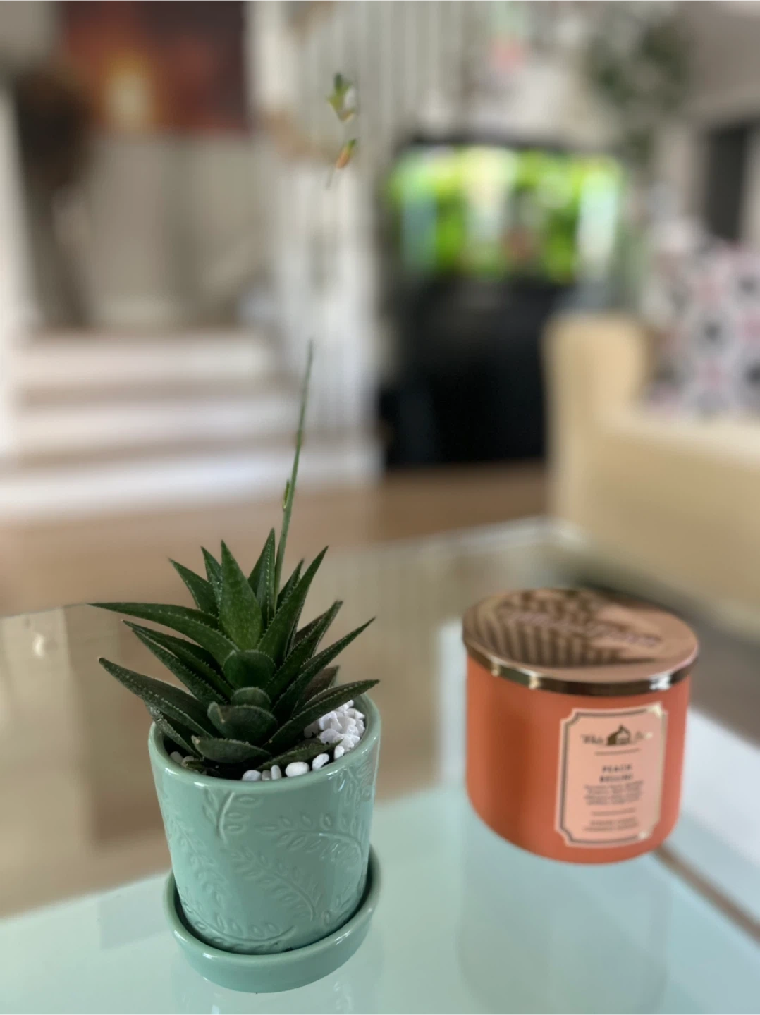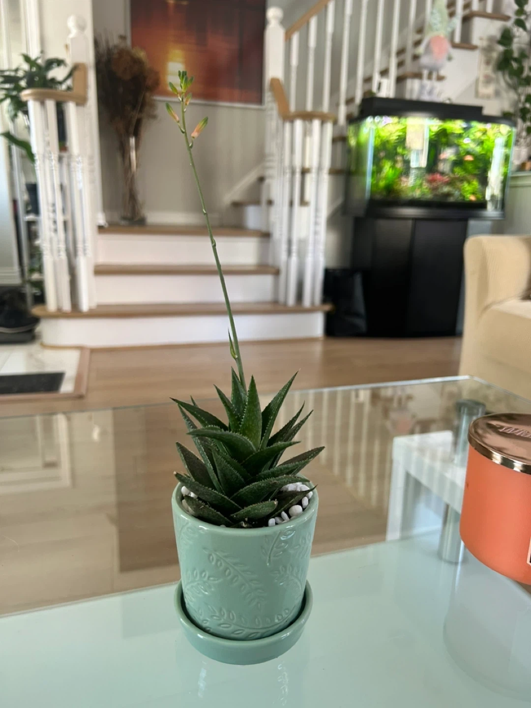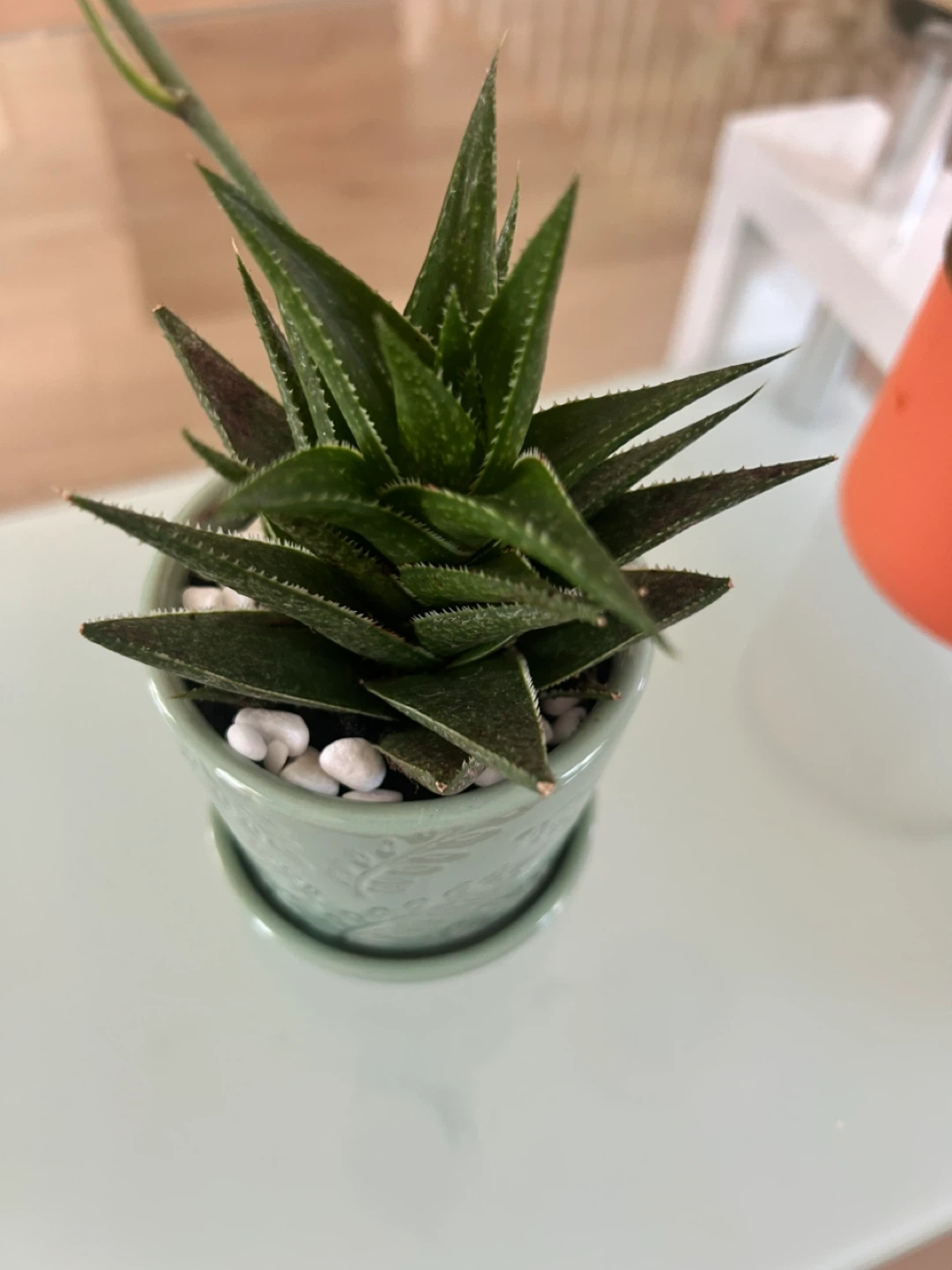 Healthy succulent plant in a mint green decorative ceramic pot with drainage saucer. White pebbles on top. Adds a touch of green to any space!