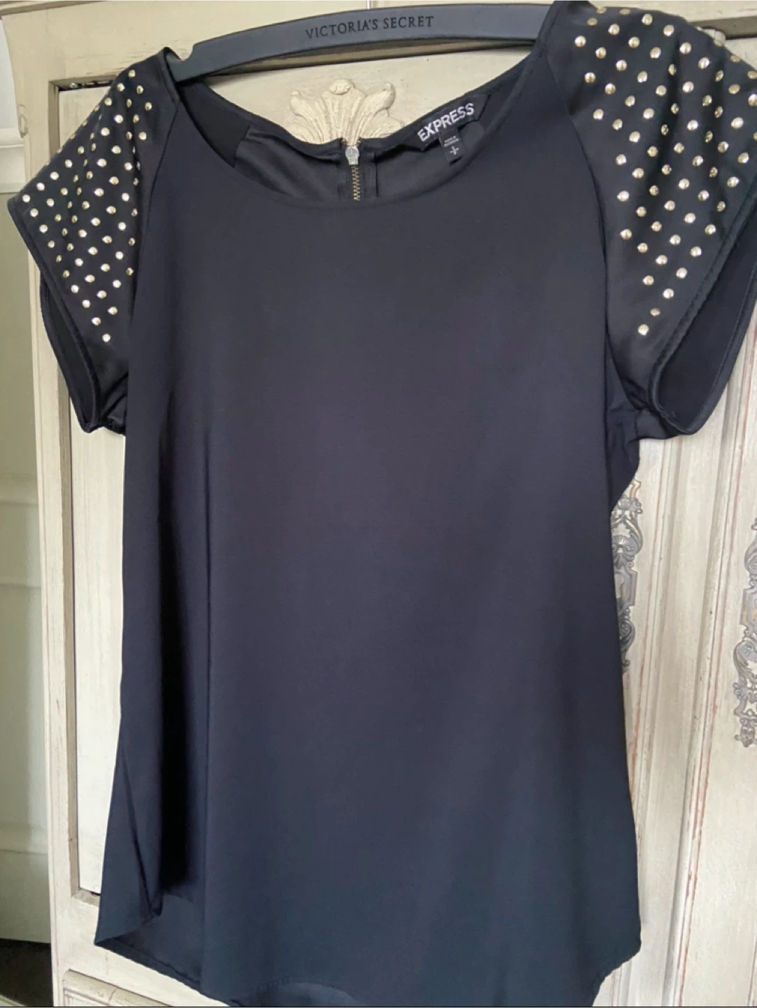 Selling a stylish black top from Express! It features eye-catching studded detailing on the sleeves, adding a bit of edge to the classic black colour. The size is S/M.