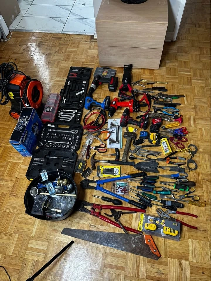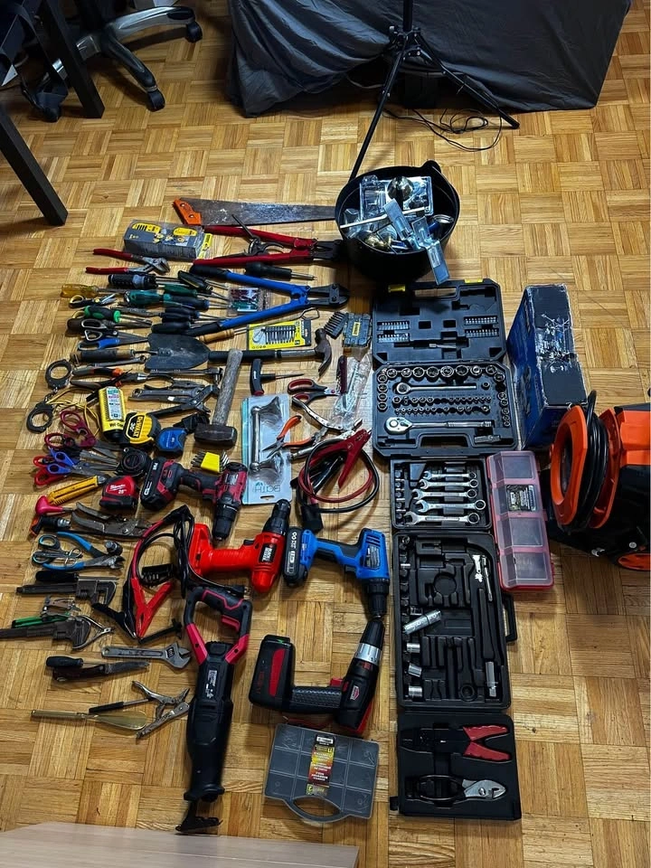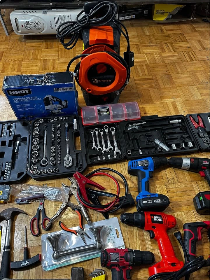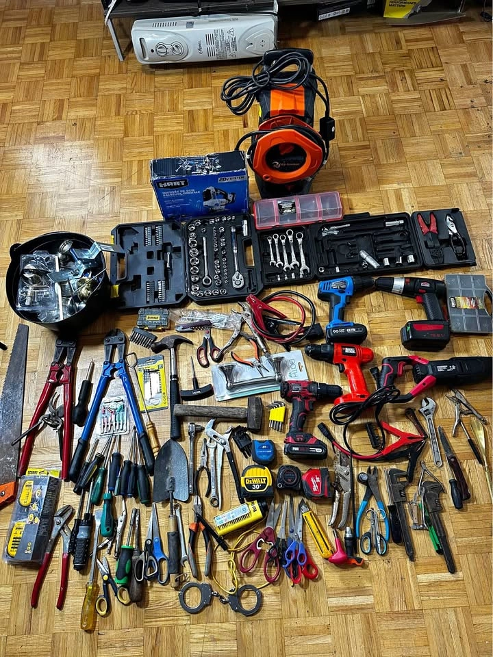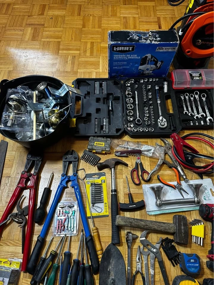 Comprehensive tool collection includes cordless power drills from Black & Decker and Jobmate, a Hart orbital jigsaw, and an extension cord reel. Set features a complete socket and ratchet kit, various metric and SAE combination wrenches, adjustable wrenches, and a pipe wrench. Pliers selection has slip-joint, needle-nose, and locking styles alongside wire cutters and tin snips. Assorted screwdrivers, hex keys, and bit sets are included. Striking tools feature a claw hammer, rubber mallet, and club hammer. Measuring tools include DeWalt and Milwaukee tape measures. Miscellaneous items consist of utility knives, scissors, garden trowels, hardware storage boxes, and handcuffs. Pickup near Bloor and Parliament. Price is firm.