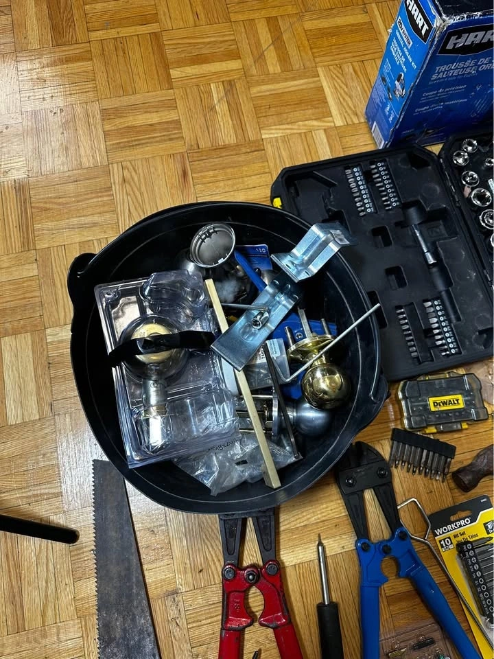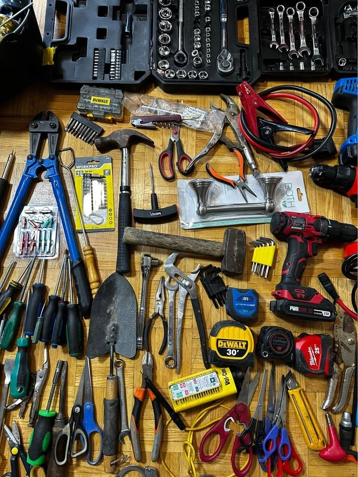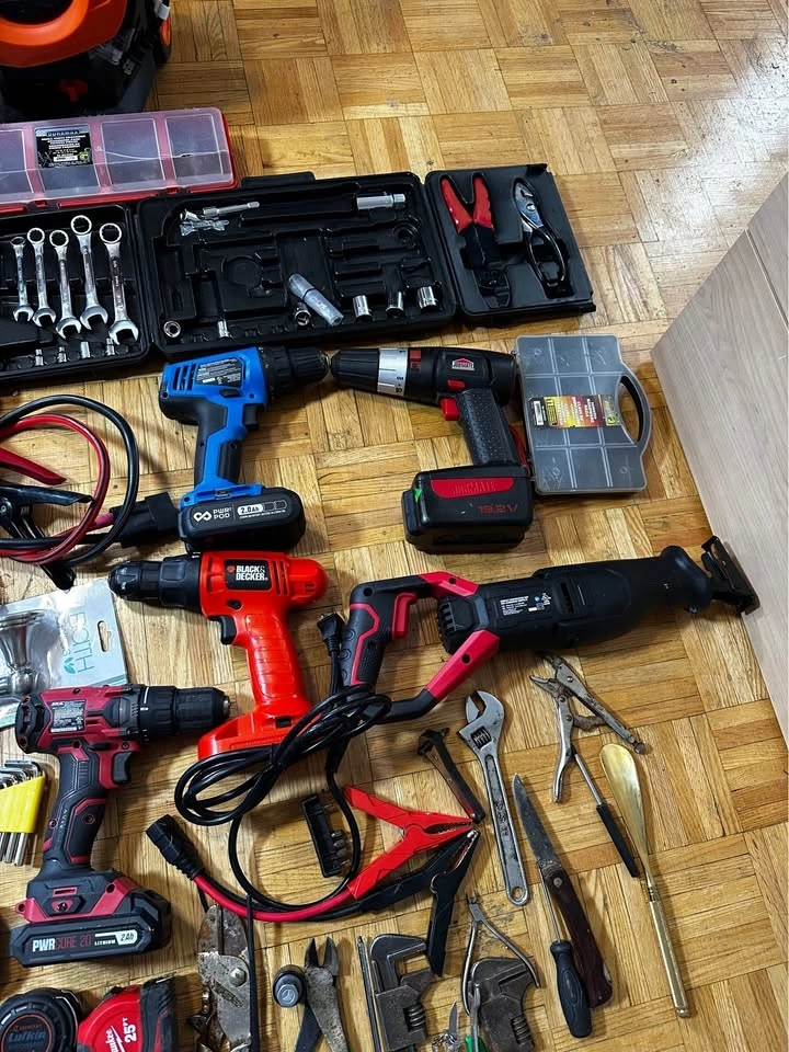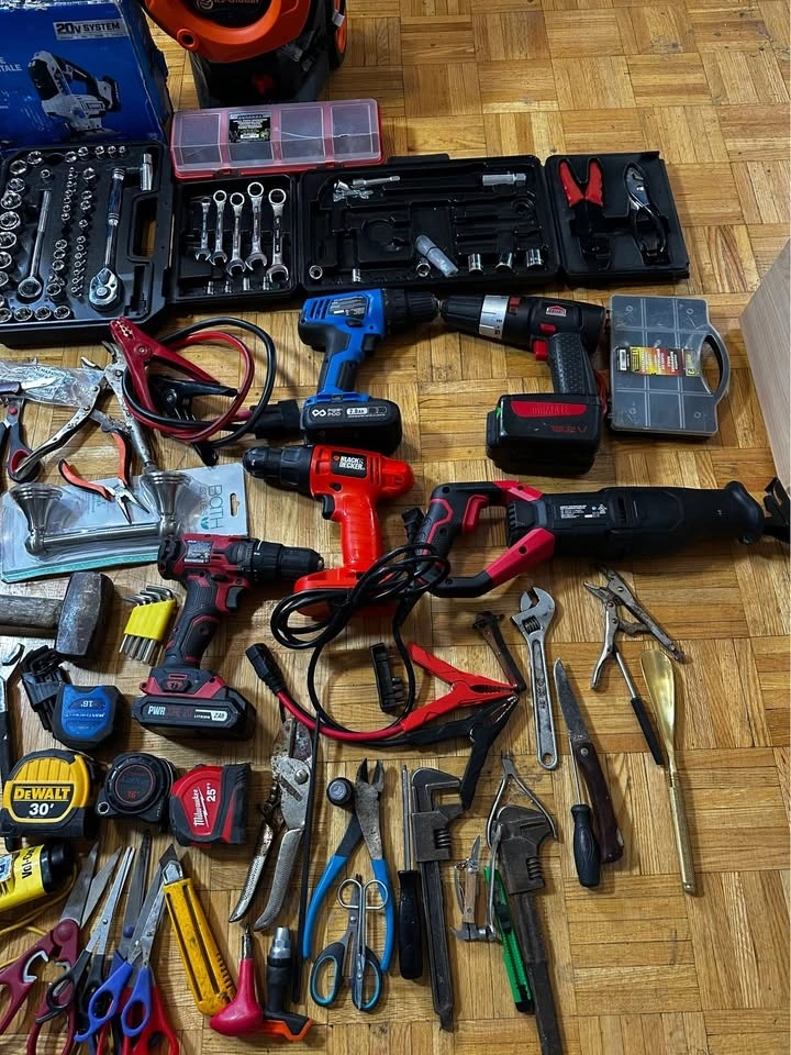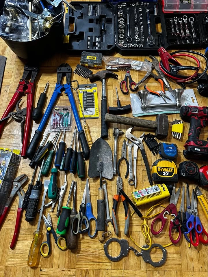 Comprehensive tool collection includes cordless power drills from Black & Decker and Jobmate, a Hart orbital jigsaw, and an extension cord reel. Set features a complete socket and ratchet kit, various metric and SAE combination wrenches, adjustable wrenches, and a pipe wrench. Pliers selection has slip-joint, needle-nose, and locking styles alongside wire cutters and tin snips. Assorted screwdrivers, hex keys, and bit sets are included. Striking tools feature a claw hammer, rubber mallet, and club hammer. Measuring tools include DeWalt and Milwaukee tape measures. Miscellaneous items consist of utility knives, scissors, garden trowels, hardware storage boxes, and handcuffs. Pickup near Bloor and Parliament. Price is firm.