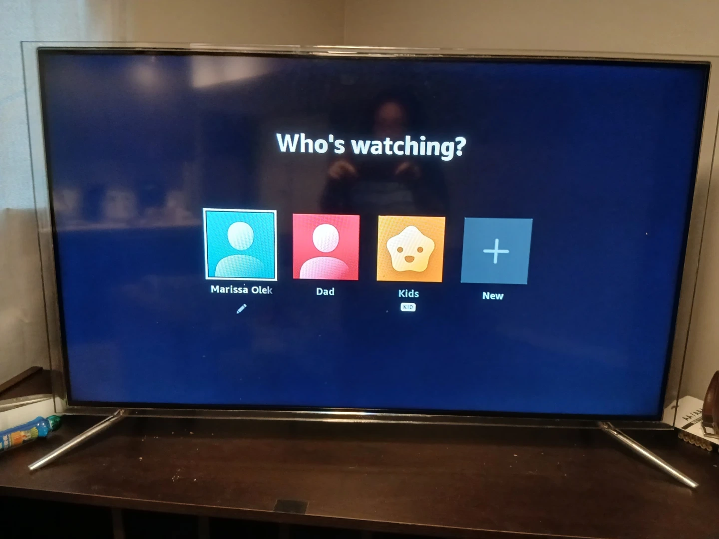 This is a Samsung smart TV with a 'Who's watching?' profile screen displayed. It features multiple user profiles, including 'Marissa Olek', 'Dad', and 'Kids'. A 'New' profile option is also available.