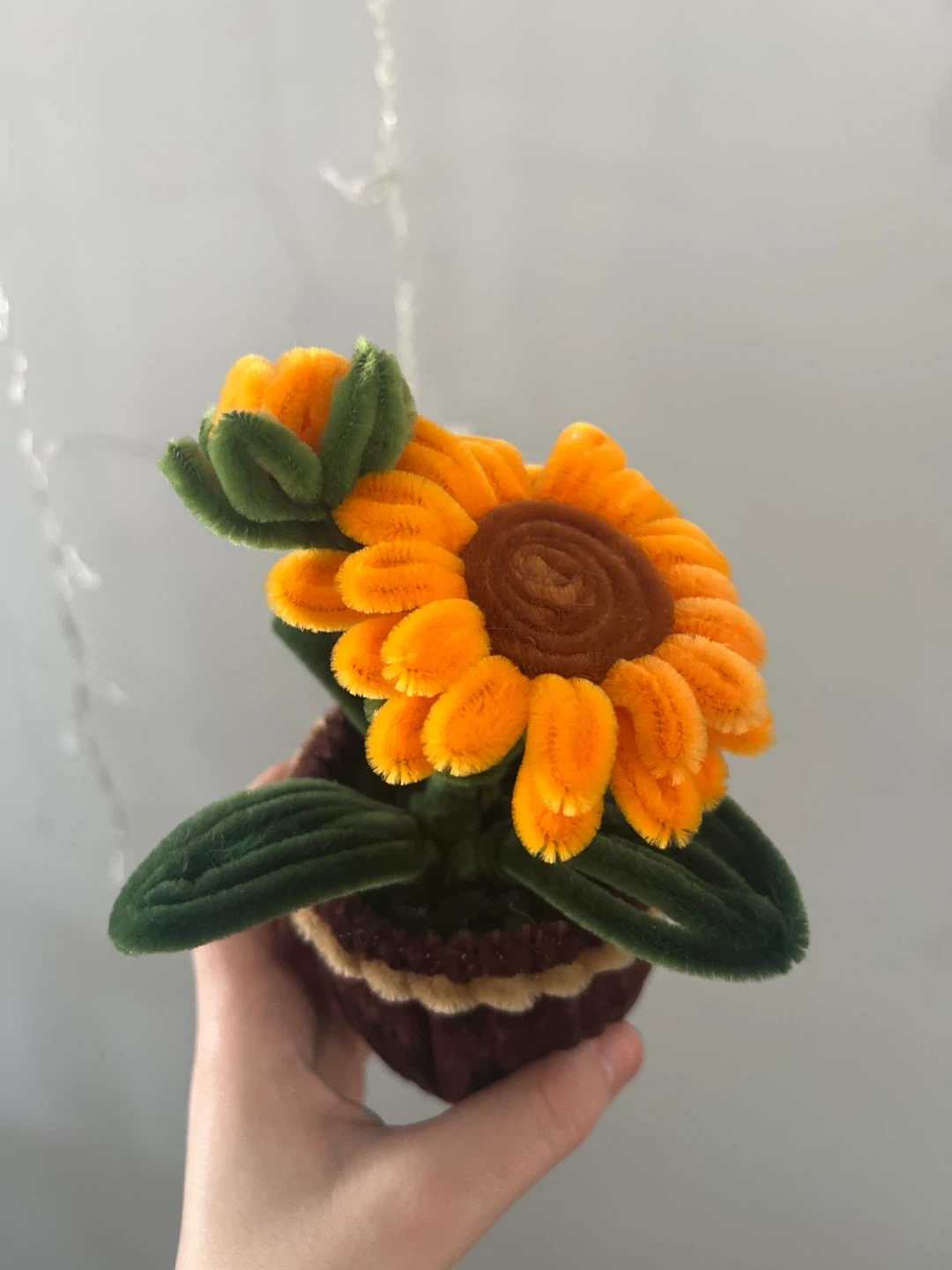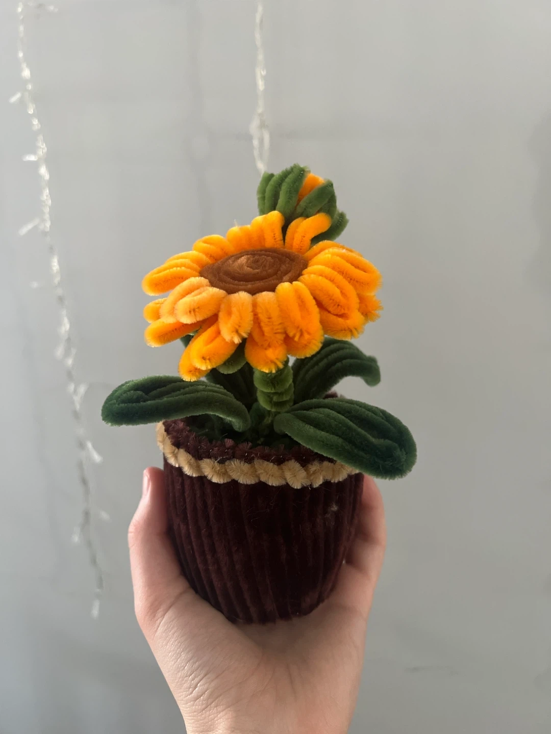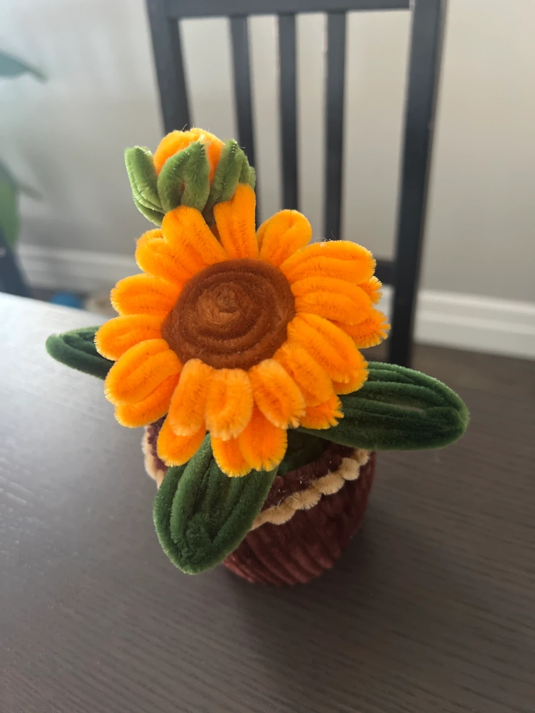 Mother’s Day gift - A cute handmade sunflower made from pipe cleaners. It's in a brown velour pot with a decorative trim. The stem and leaves are green pipe cleaners.