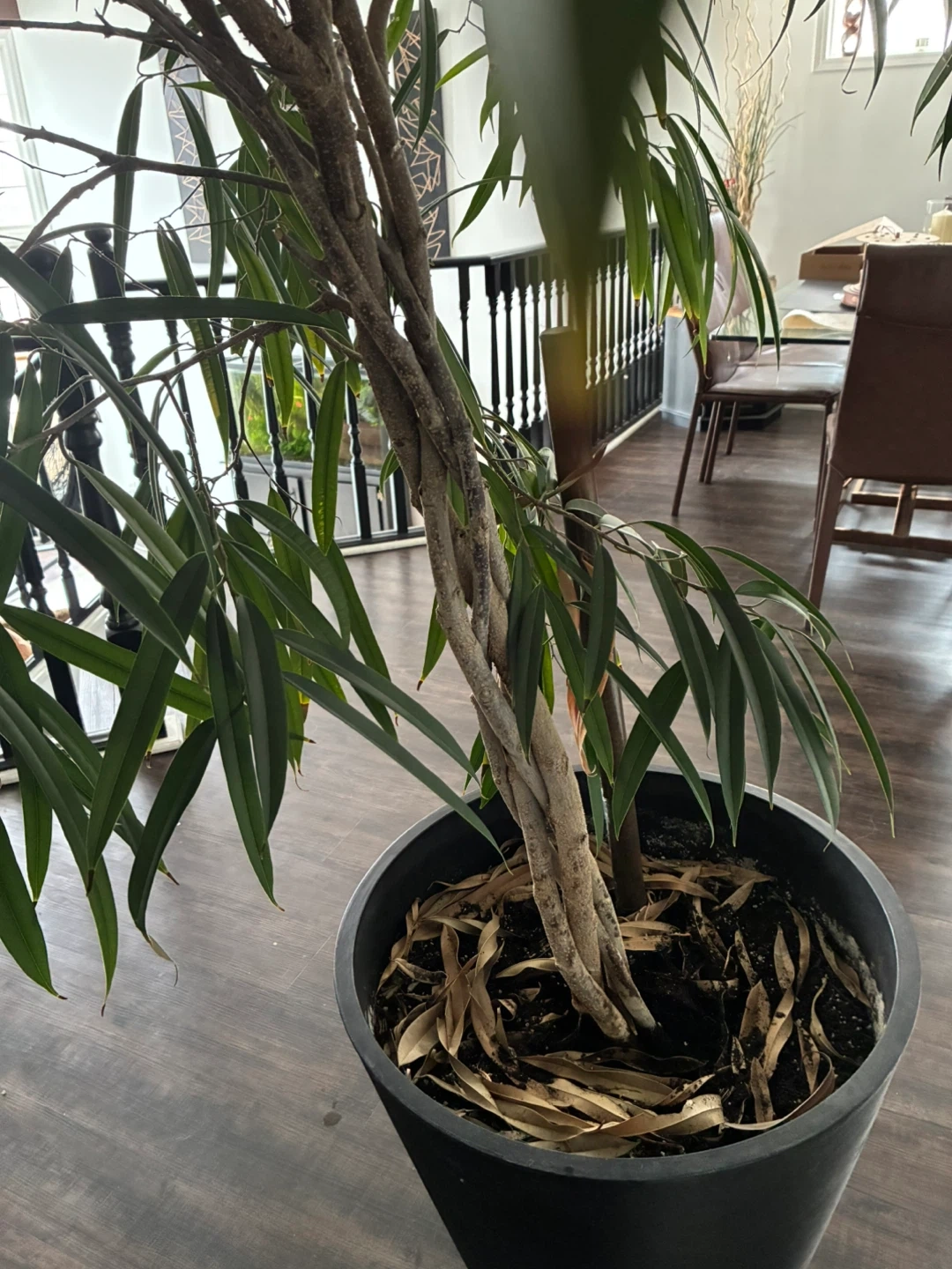 This is a large ficus tree with a braided trunk, housed in a black pot. It's a beautiful live plant that would add greenery to any indoor space. The pot is approximately 18 inches tall.