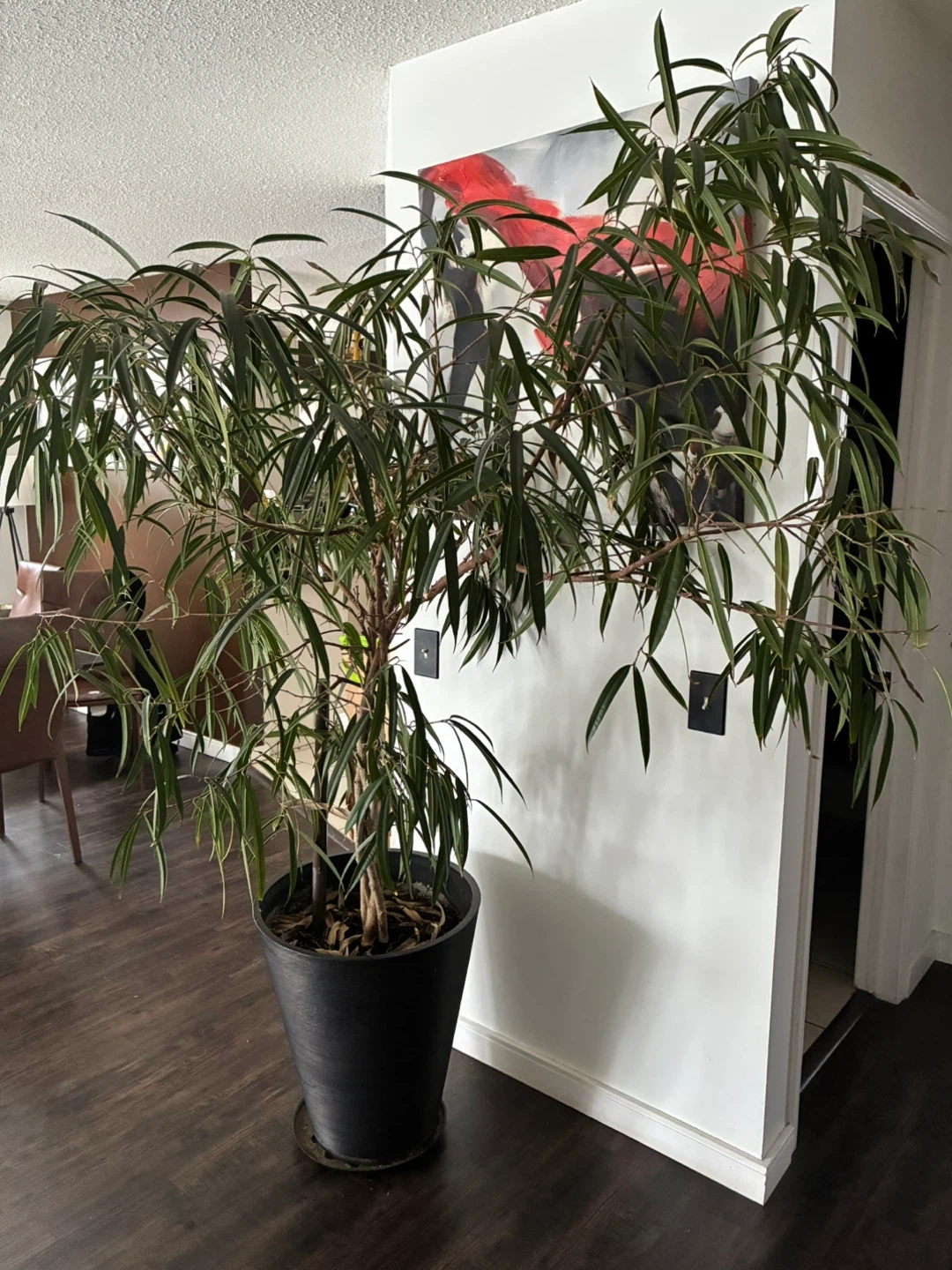 This is a large ficus tree with a braided trunk, housed in a black pot. It's a beautiful live plant that would add greenery to any indoor space. The pot is approximately 18 inches tall.