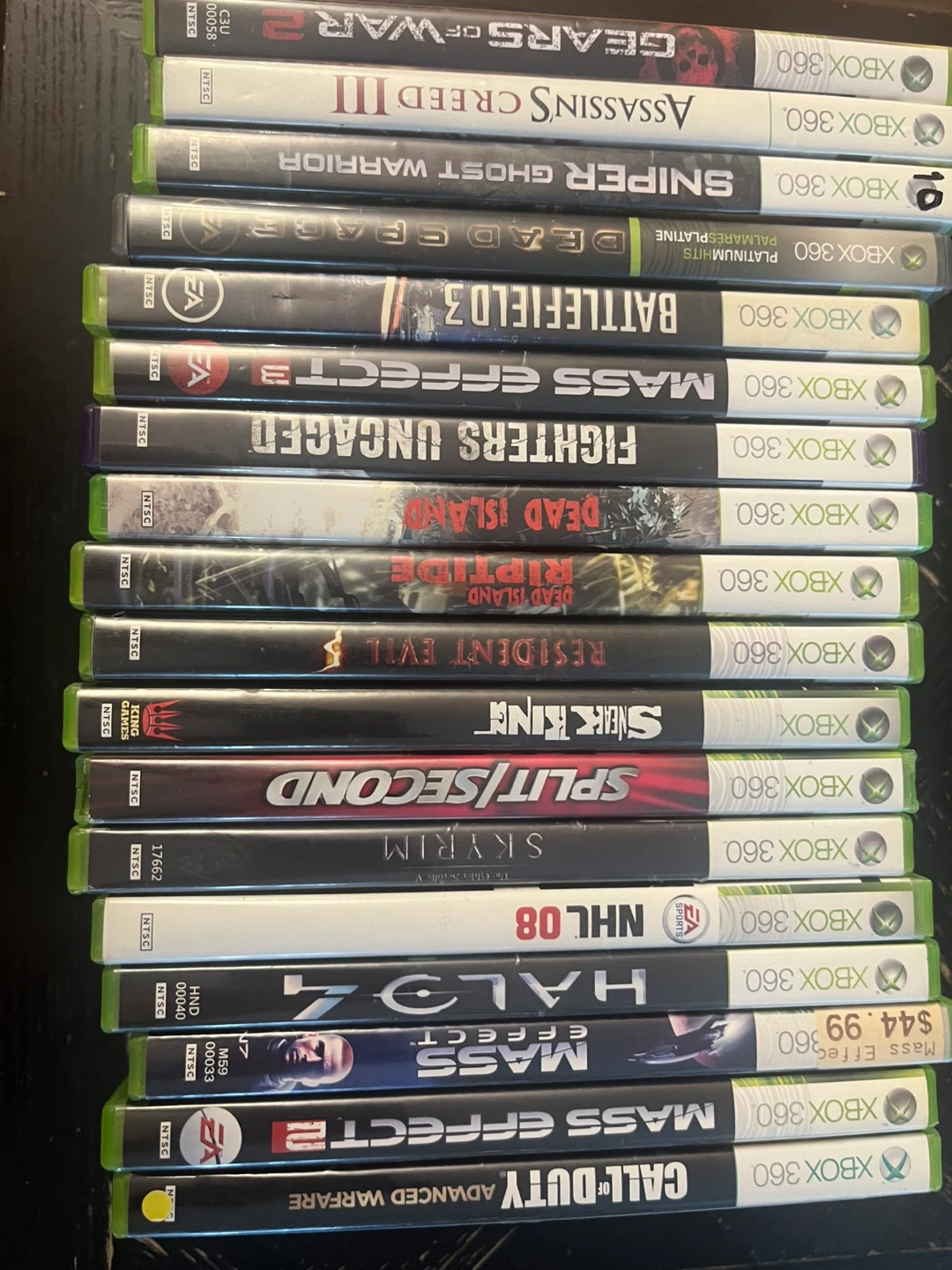 A collection of popular Xbox 360 video games. Includes titles like Gears of War, Assassin's Creed III, Battlefield 3, and Halo 4. Games are for the Xbox 360 console.