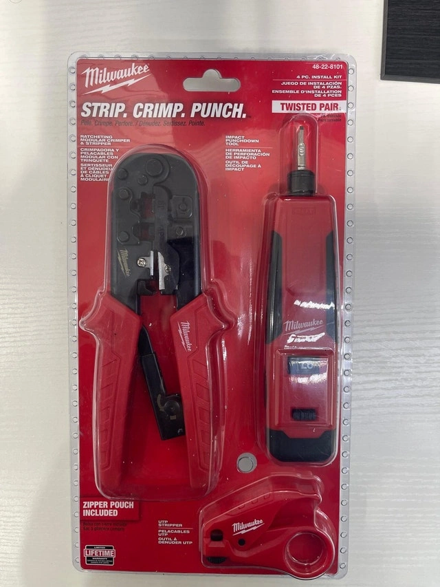 Brand new in box. This MILWAUKEE Twisted Pair Install Kit provides all the tools needed to strip, crimp, and punch twisted pair cables. The kit includes an Impacting Punchdown, a Ratcheting Modular Crimper & Stripper, and a UTP Stripper. It also comes with a zippered pouch for storage. Backed by Milwaukee's limited lifetime warranty. Pickup location: Islington and Rexdale, Etobicoke. Cash only.