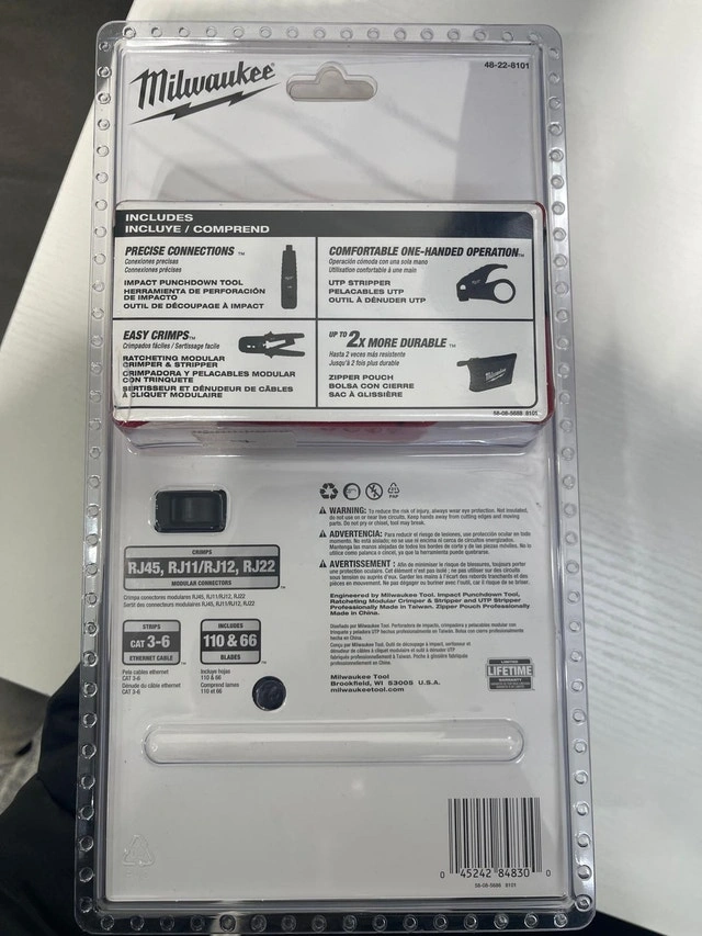 Brand new in box. This MILWAUKEE Twisted Pair Install Kit provides all the tools needed to strip, crimp, and punch twisted pair cables. The kit includes an Impacting Punchdown, a Ratcheting Modular Crimper & Stripper, and a UTP Stripper. It also comes with a zippered pouch for storage. Backed by Milwaukee's limited lifetime warranty. Pickup location: Islington and Rexdale, Etobicoke. Cash only.