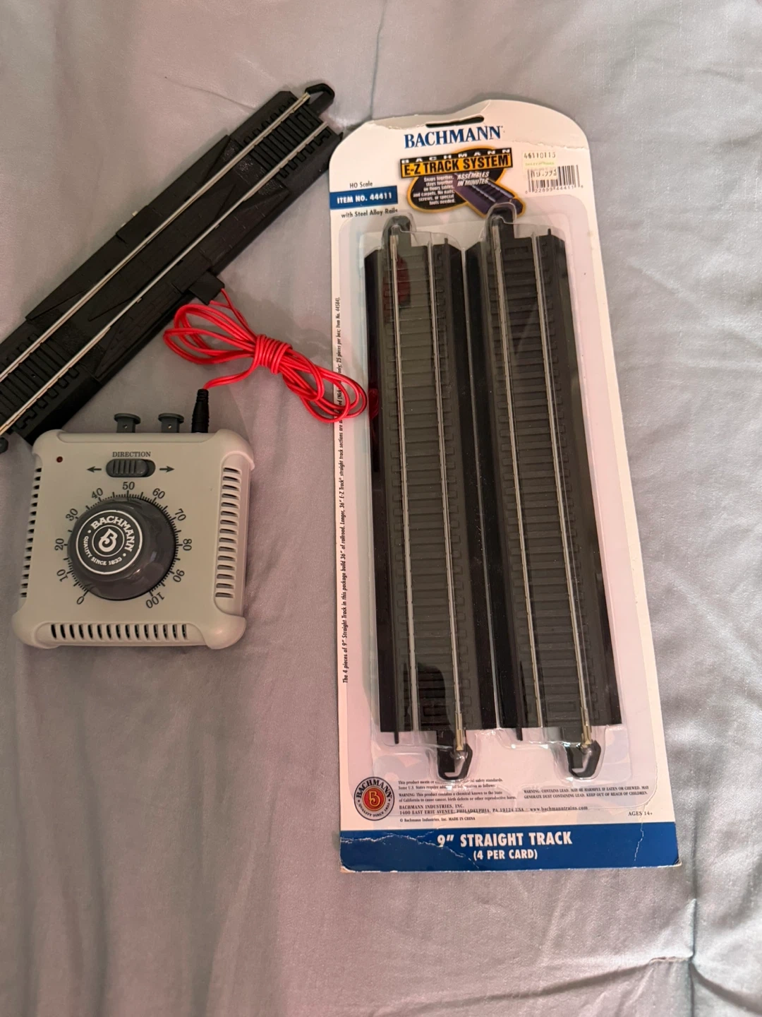 This Bachmann HO scale E-Z Track System includes four 9-inch straight track pieces. The set also comes with a controller and connecting wires for your model train setup. It's designed for quick assembly, letting you build your railroad in minutes. Ideal for expanding existing layouts or starting a new one! No power cord