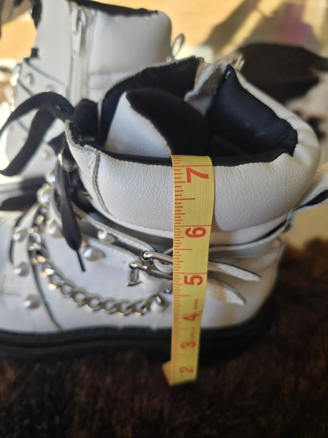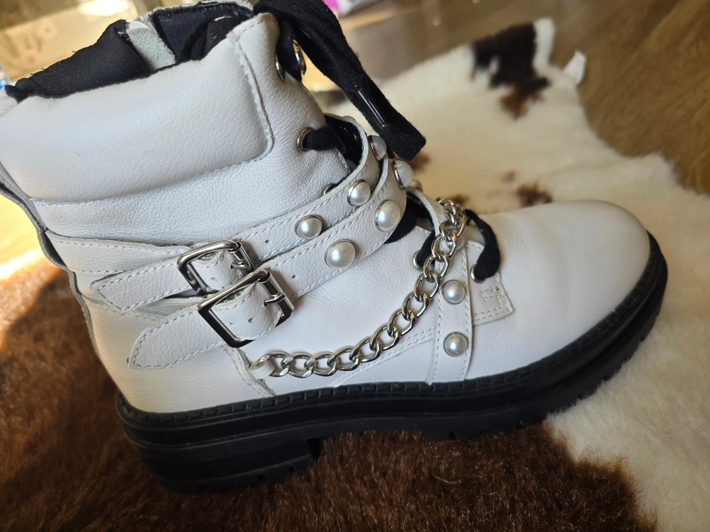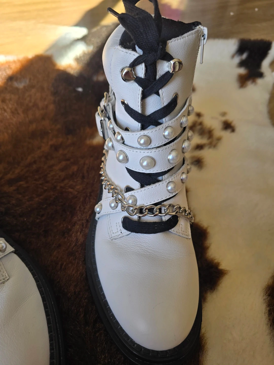 These white combat boots feature a lace-up front with side zippers. They're adorned with faux pearls and a decorative chain detail across the vamp. The shaft height appears to be approximately 7 inches.