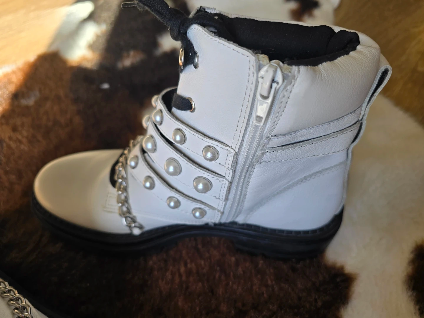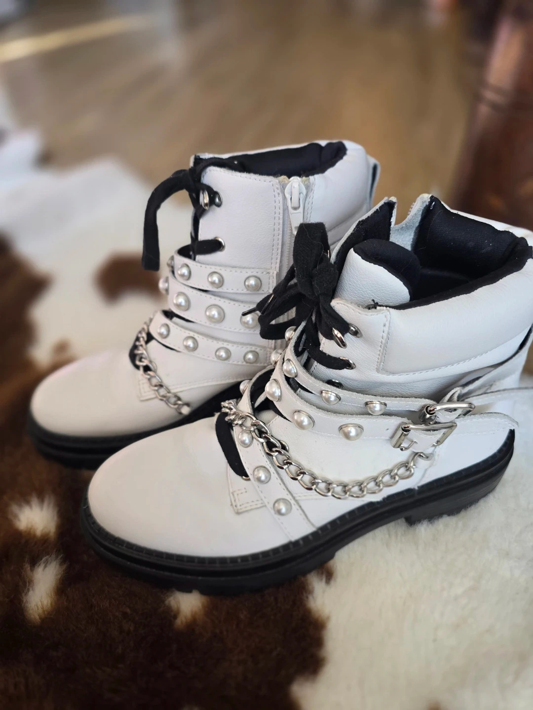 These white combat boots feature a lace-up front with side zippers. They're adorned with faux pearls and a decorative chain detail across the vamp. The shaft height appears to be approximately 7 inches.