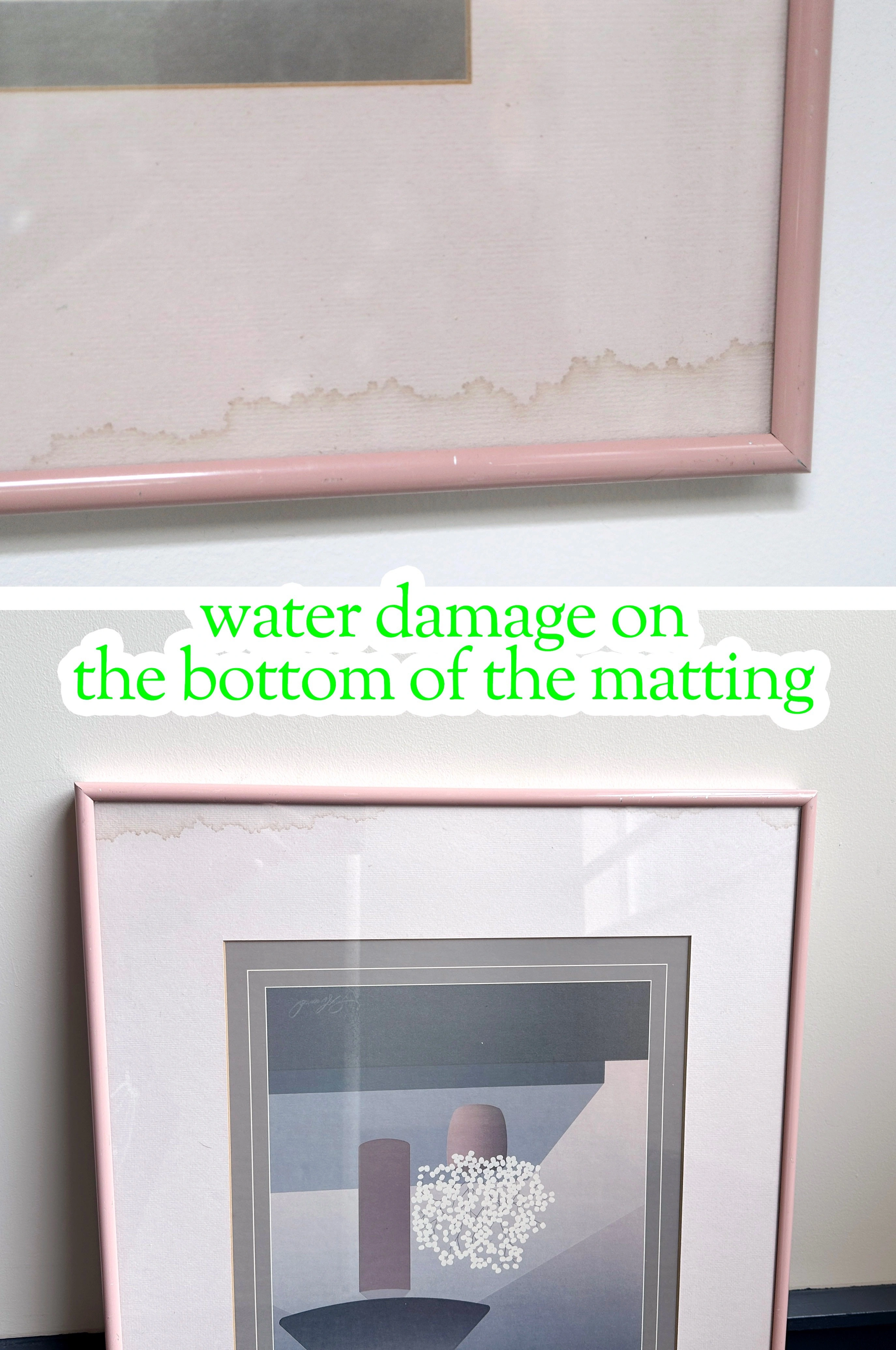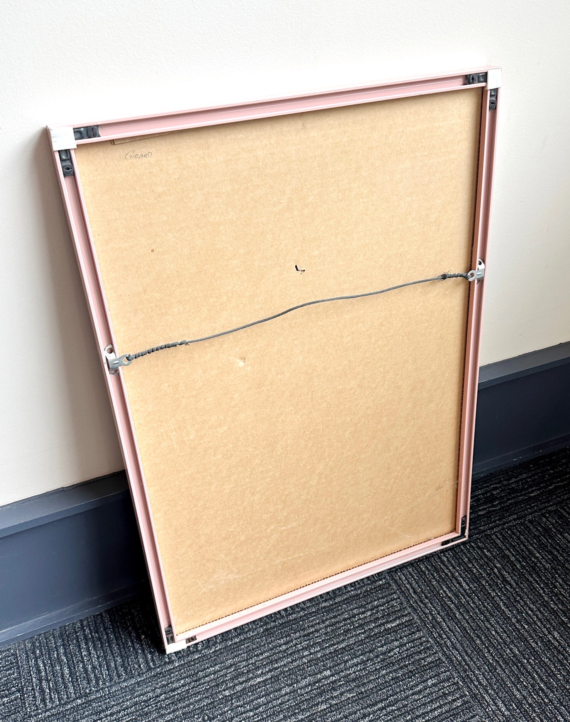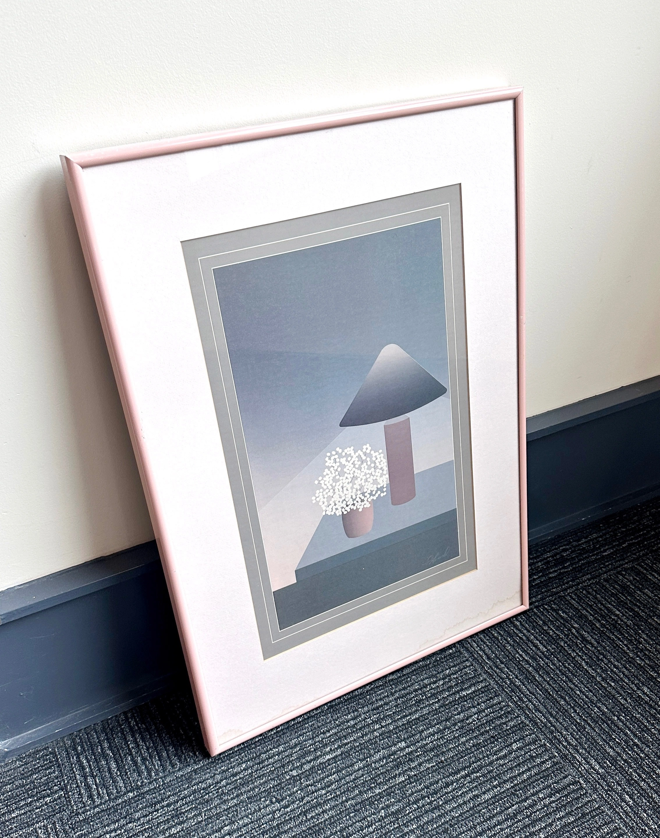 A framed print of a lamp and white florals by Canadian artist Pierre Girard in gradient shades of dusty pink and cool smoky grey. Framed in a dusty pink enamelled metal frame. Wire on the back for hanging [ YEAR ] 1980s, reproduction vintage [ BRAND ] Pierre Girard [ CONDITION ] great • glass is in excellent condition • enamel on frame has some scuffs on the edges revealing silver toned metal underneath • matting has water damage on the bottom, can be replaced [ DIMENSIONS ] print measures 16" x 12" without the matting, the entire frame measures 25" x 18"