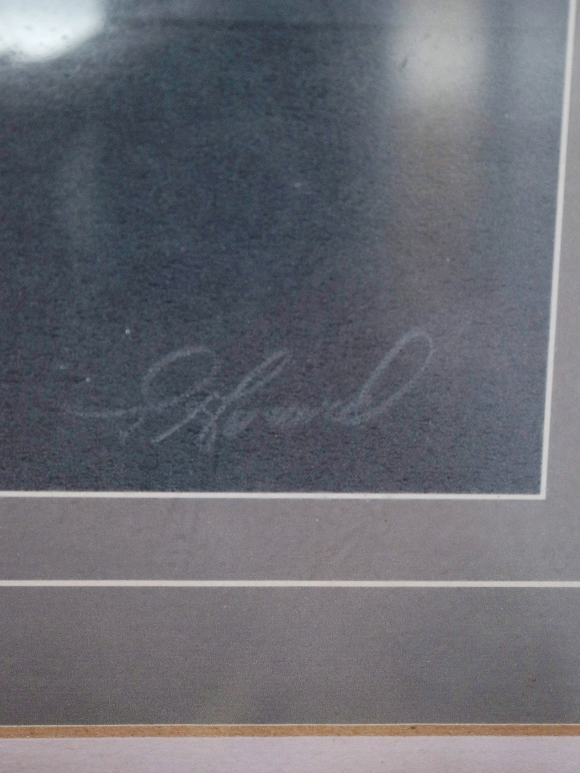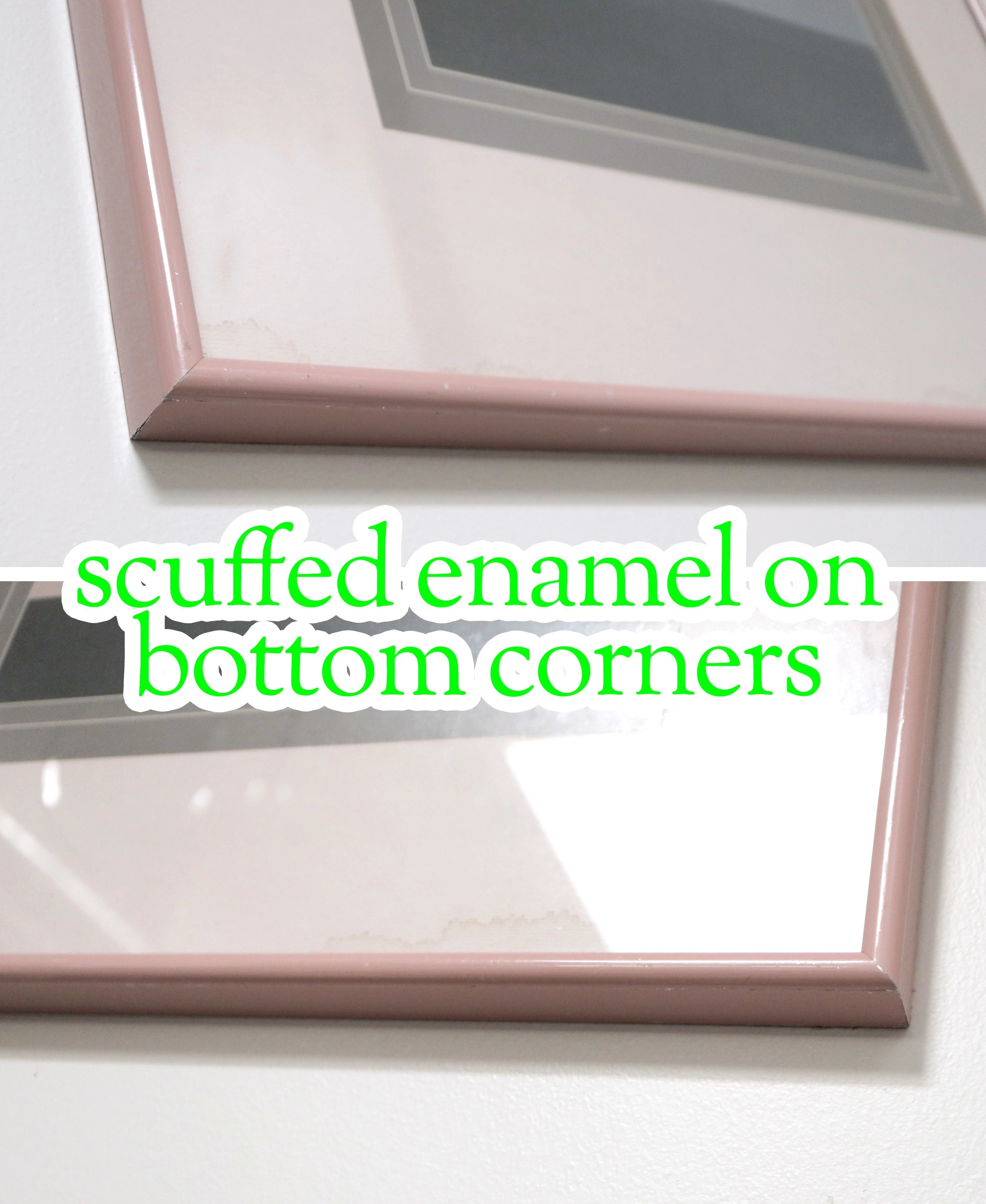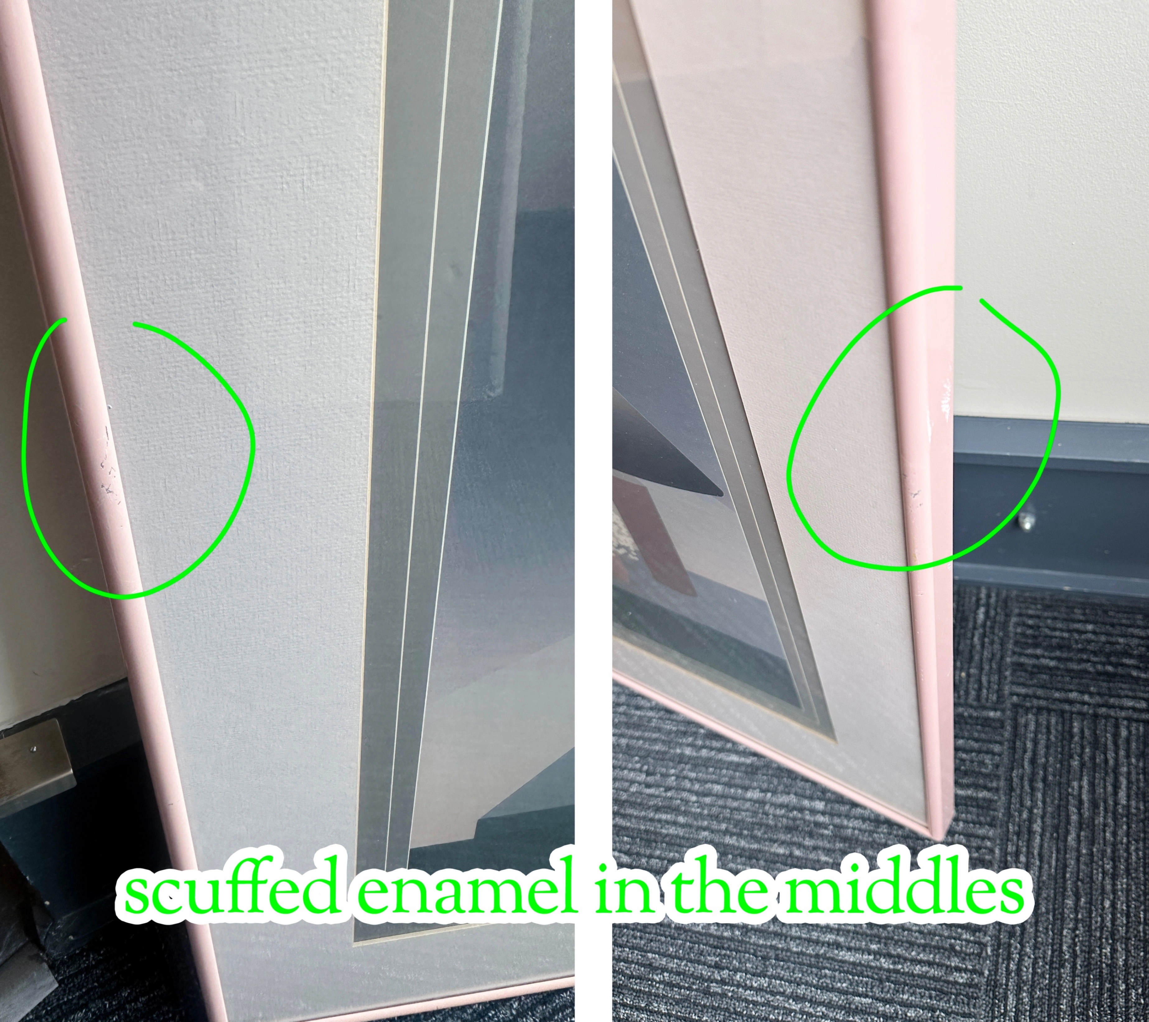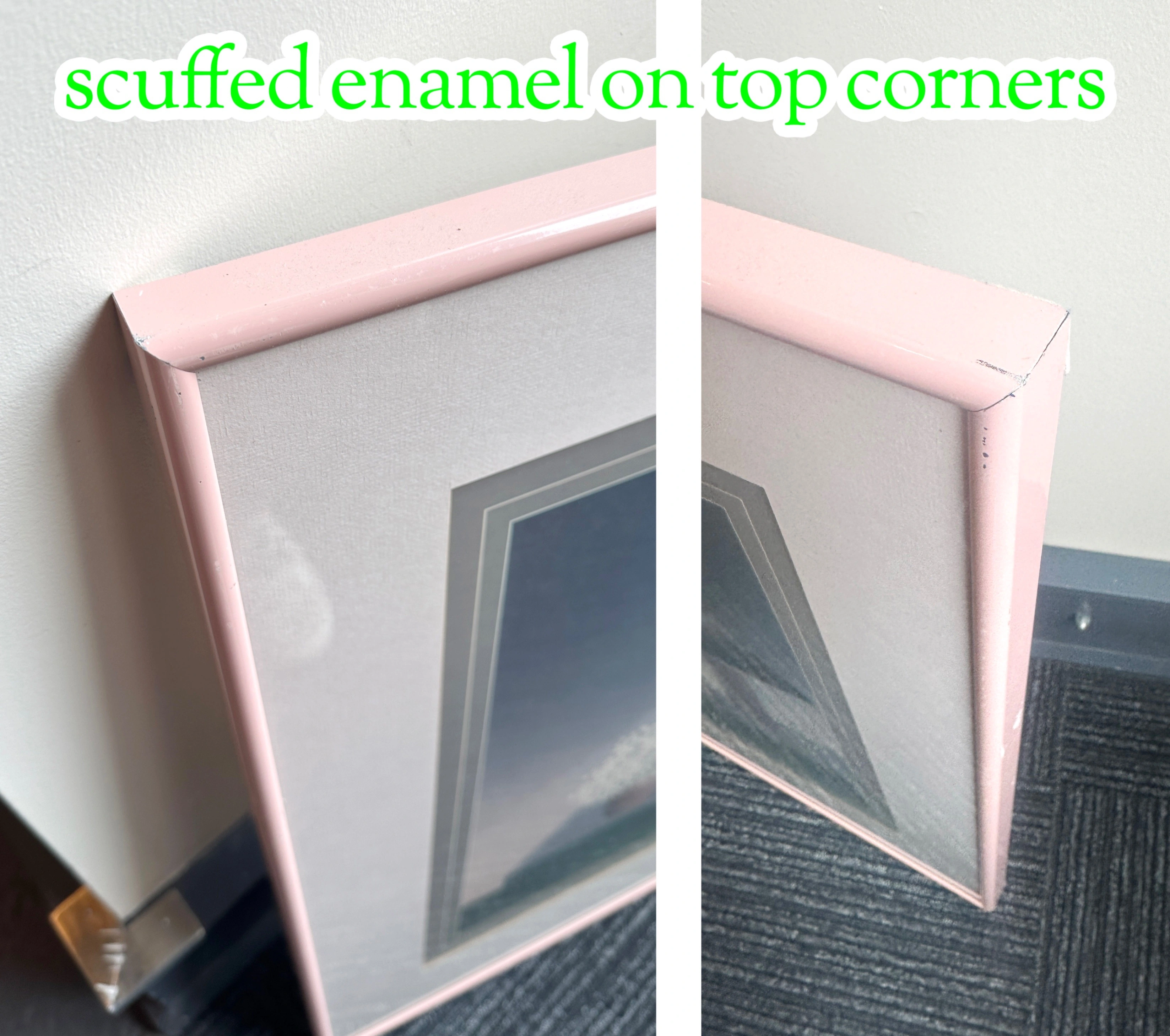 A framed print of a lamp and white florals by Canadian artist Pierre Girard in gradient shades of dusty pink and cool smoky grey. Framed in a dusty pink enamelled metal frame. Wire on the back for hanging [ YEAR ] 1980s, reproduction vintage [ BRAND ] Pierre Girard [ CONDITION ] great • glass is in excellent condition • enamel on frame has some scuffs on the edges revealing silver toned metal underneath • matting has water damage on the bottom, can be replaced [ DIMENSIONS ] print measures 16" x 12" without the matting, the entire frame measures 25" x 18"