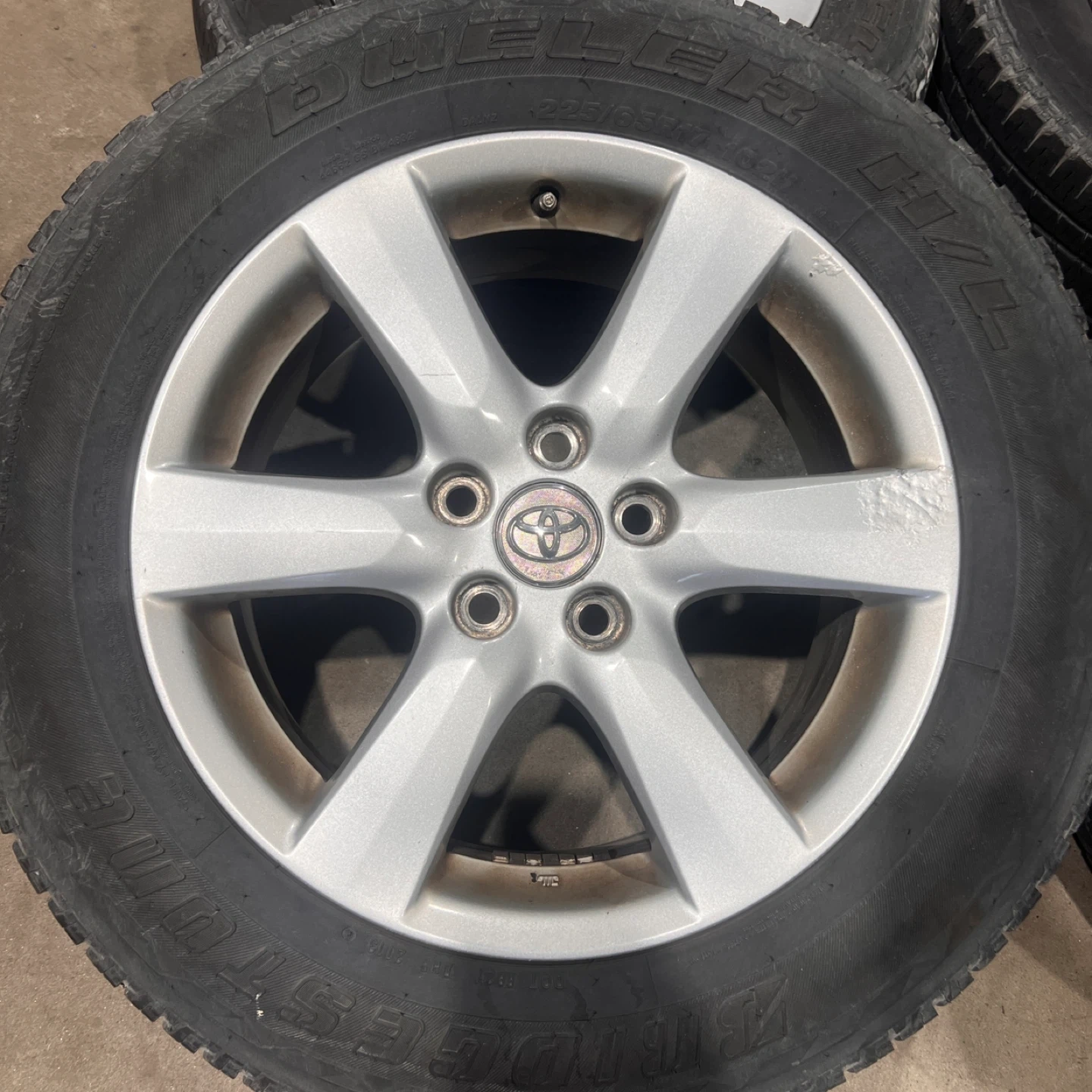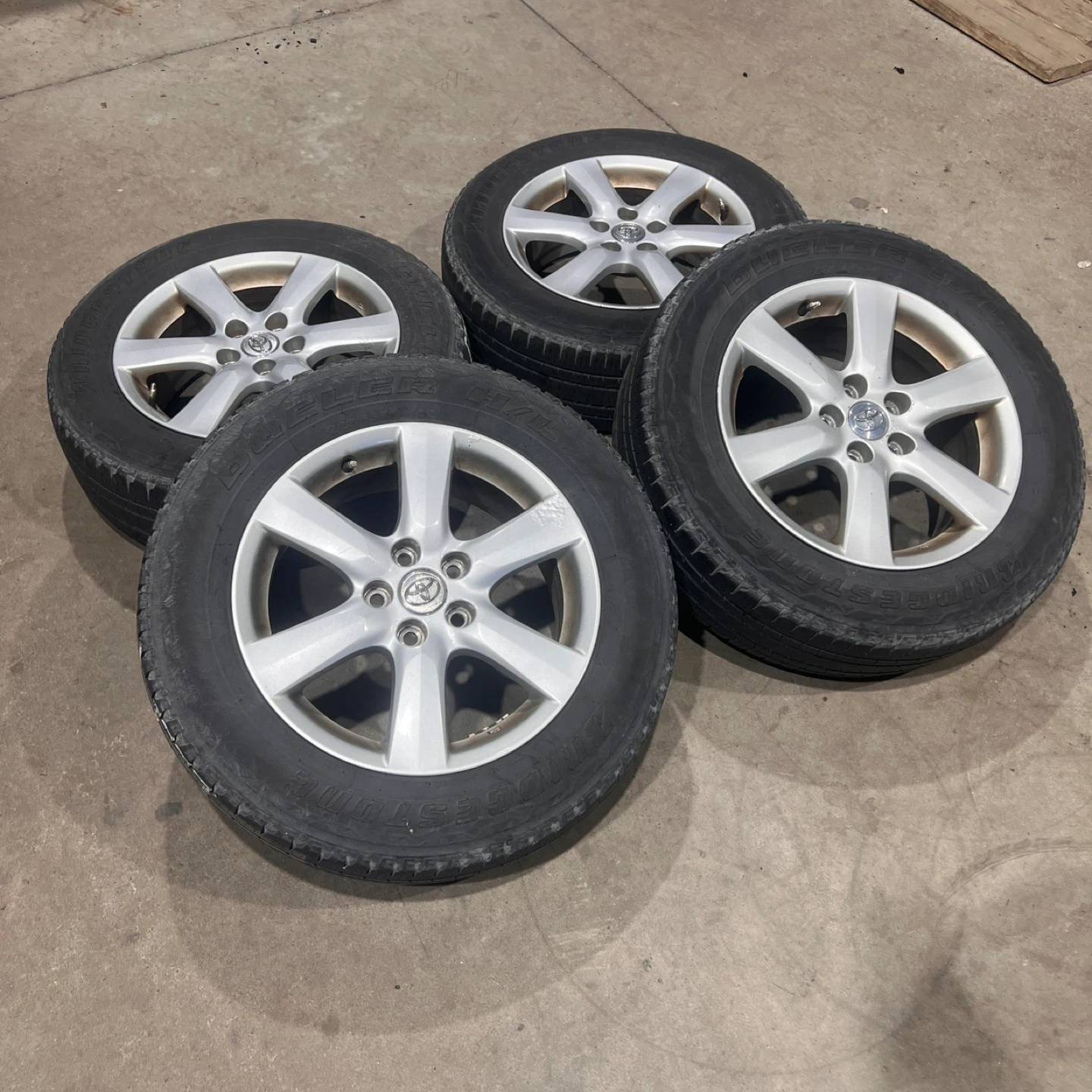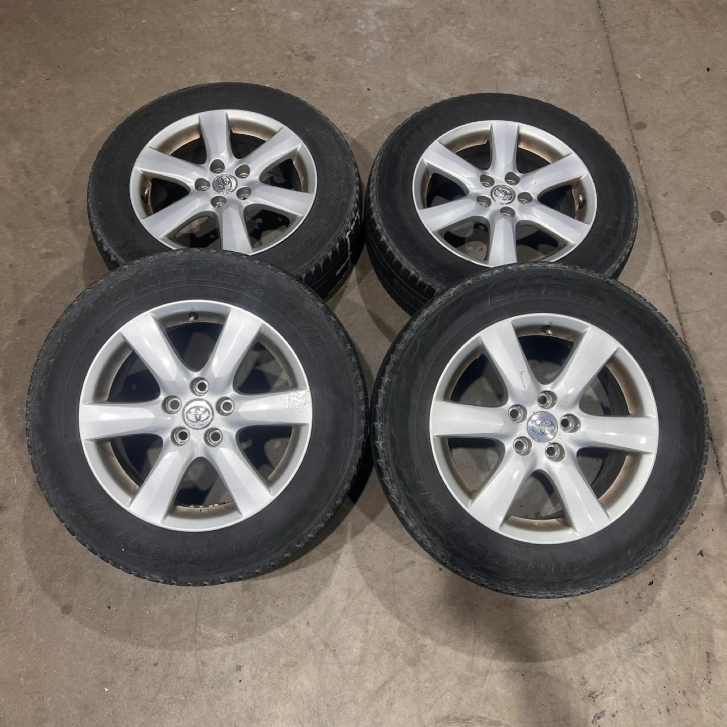 Selling a set of 4 Toyota 17” rims with Bridgestone Dueler tires. The tire size is 225/65R17. They show some signs of wear, but are still in good condition for their age. Tires are no good and will be removed. Fits all years Toyota RAV4 1996-2025 Offset is 45, center bore is 60.1, bolt pattern is 5x114.3