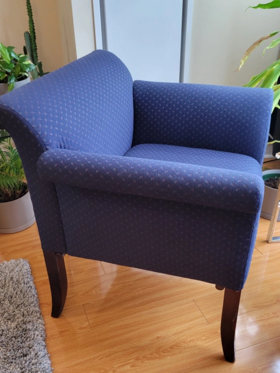 Some scuffs and nicks on the legs. Fabric on seat of chair slightly discoloured from sun exposure near window (can see in the photo). Can throw in 2 throw pillows if wanted.