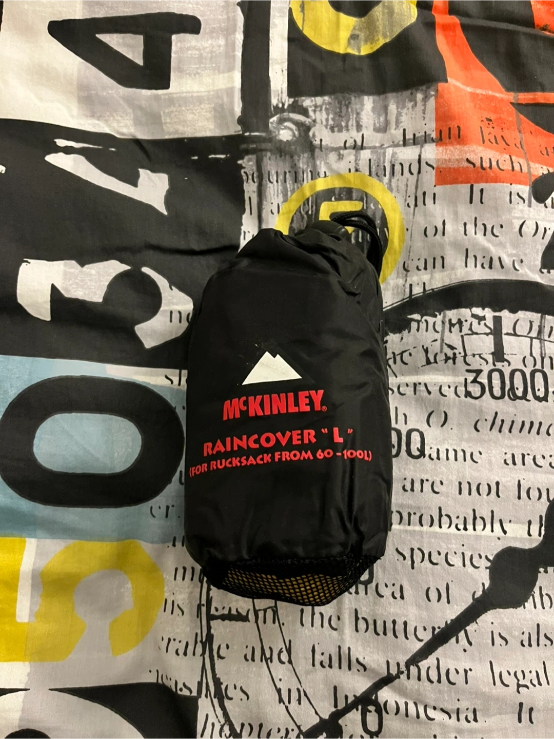 McKinley raincover in yellow. It's a size "L" for rucksacks from 60-100L. It's made from water-resistant material. Protect your gear from the elements!