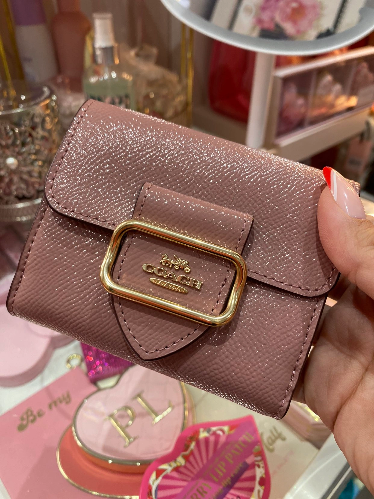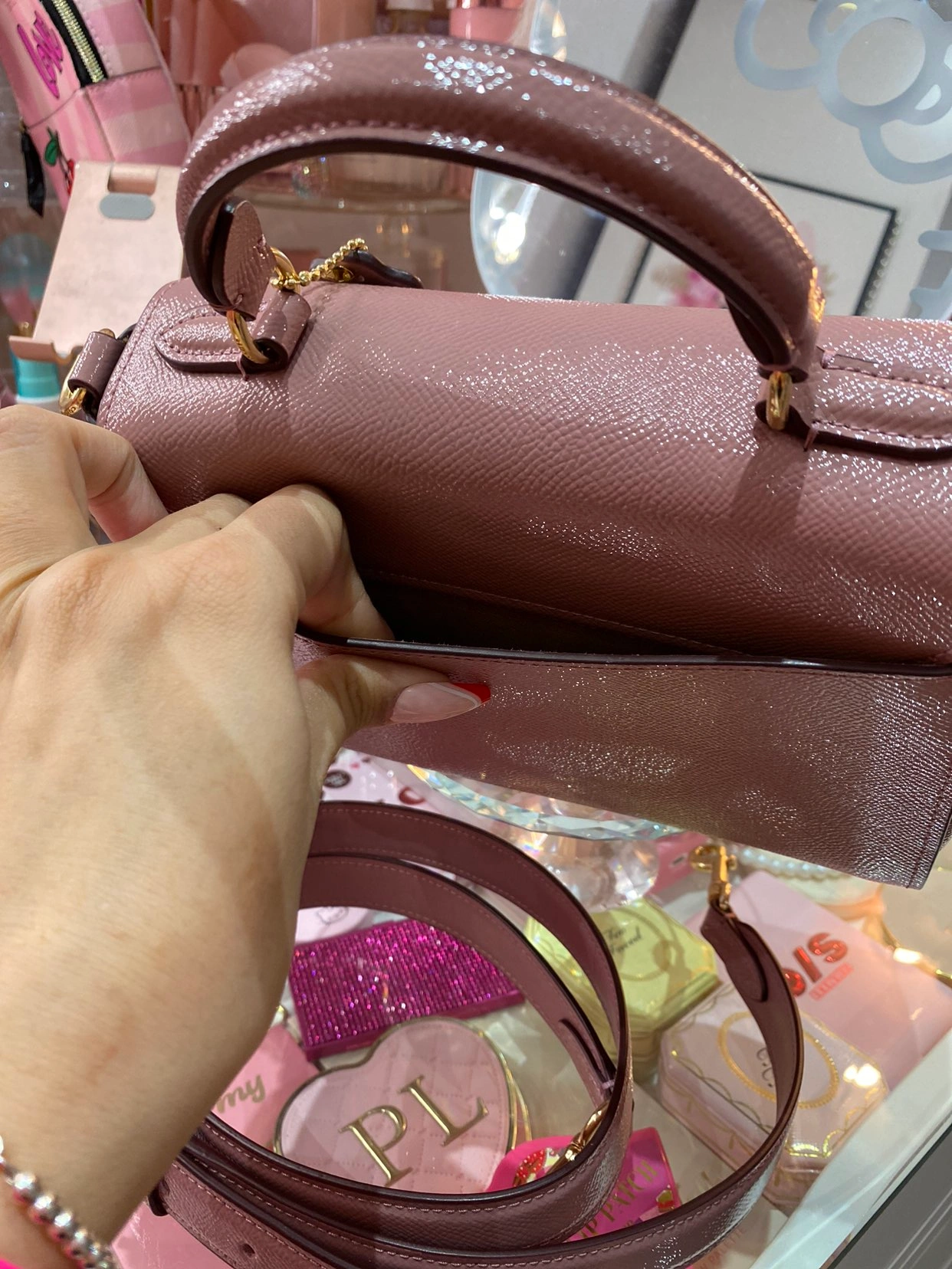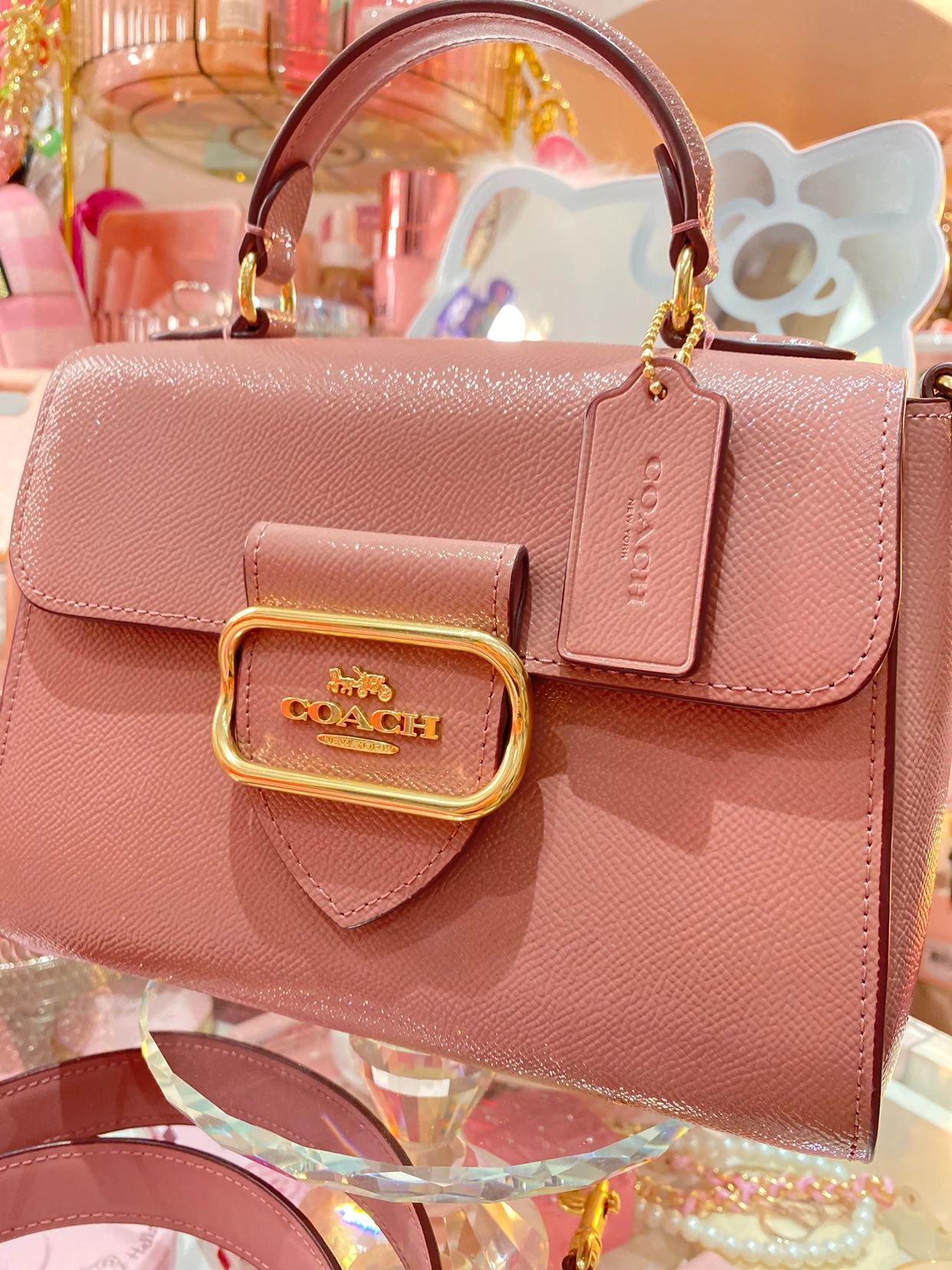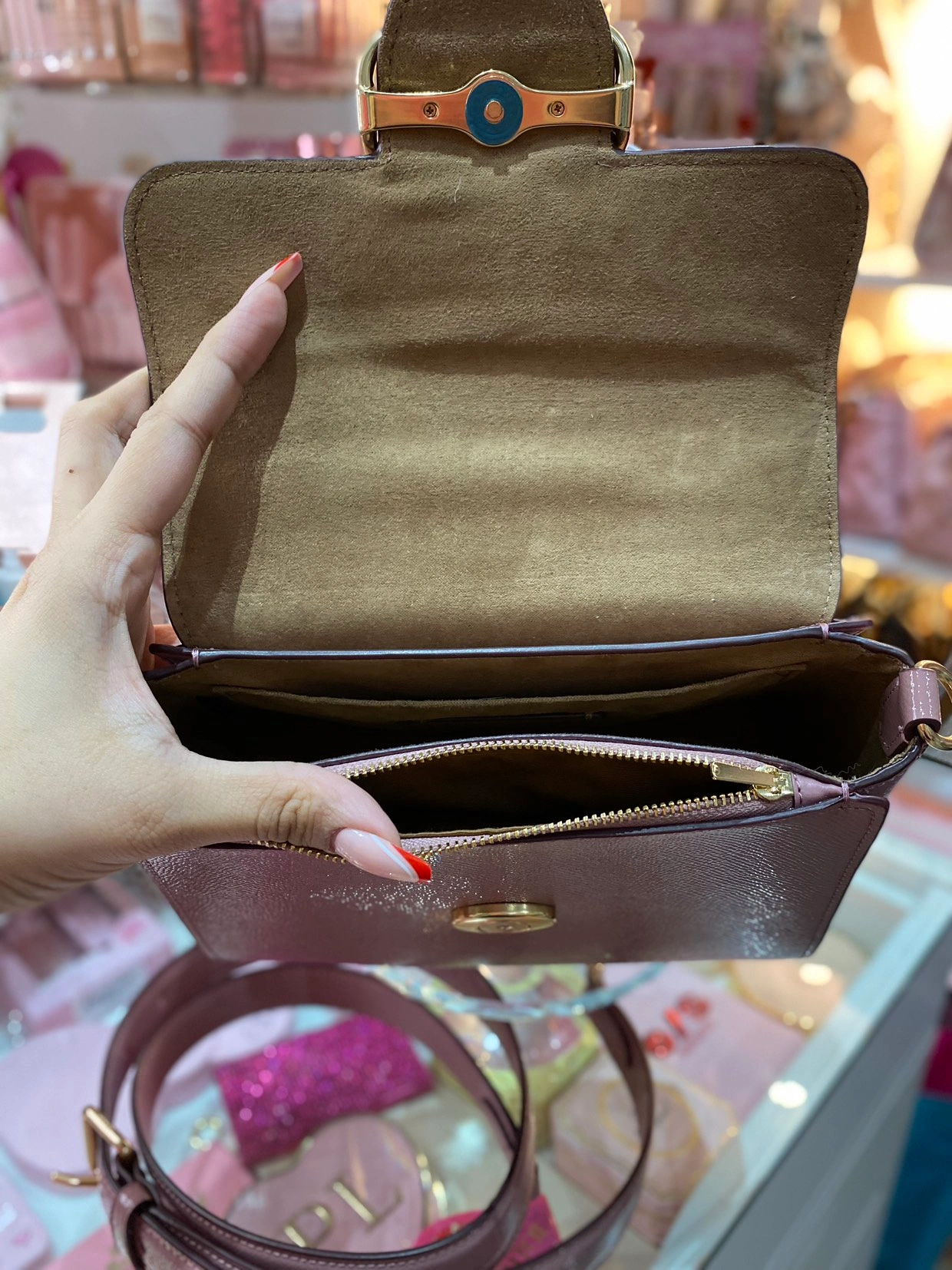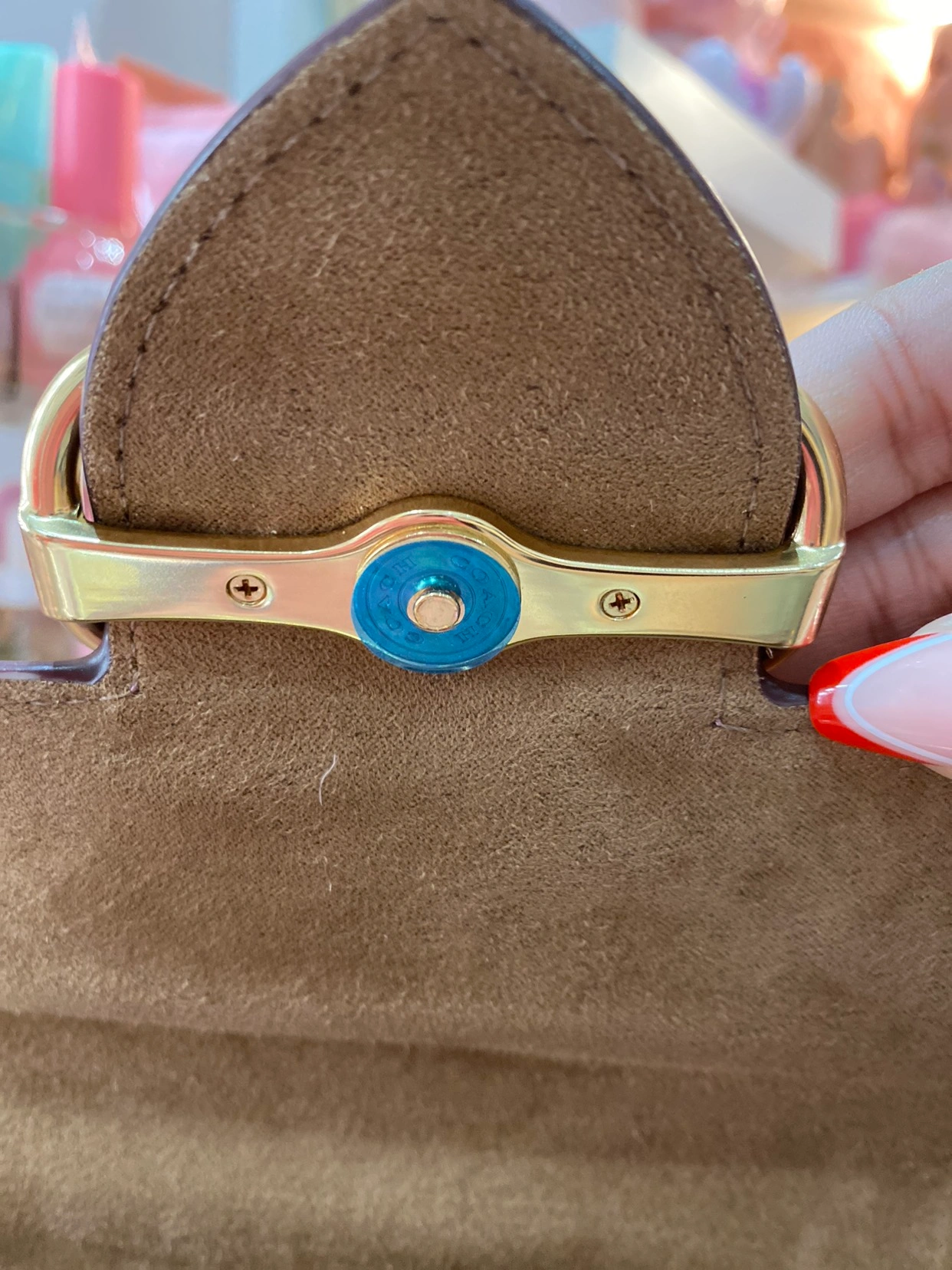 Gold hardware and really gorgeous colour and design. Easy to clean.