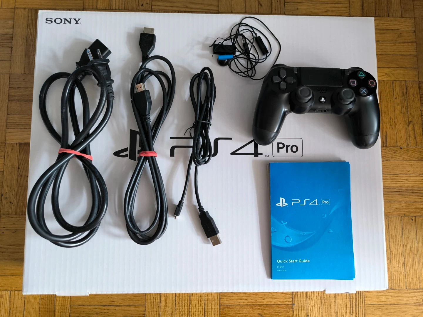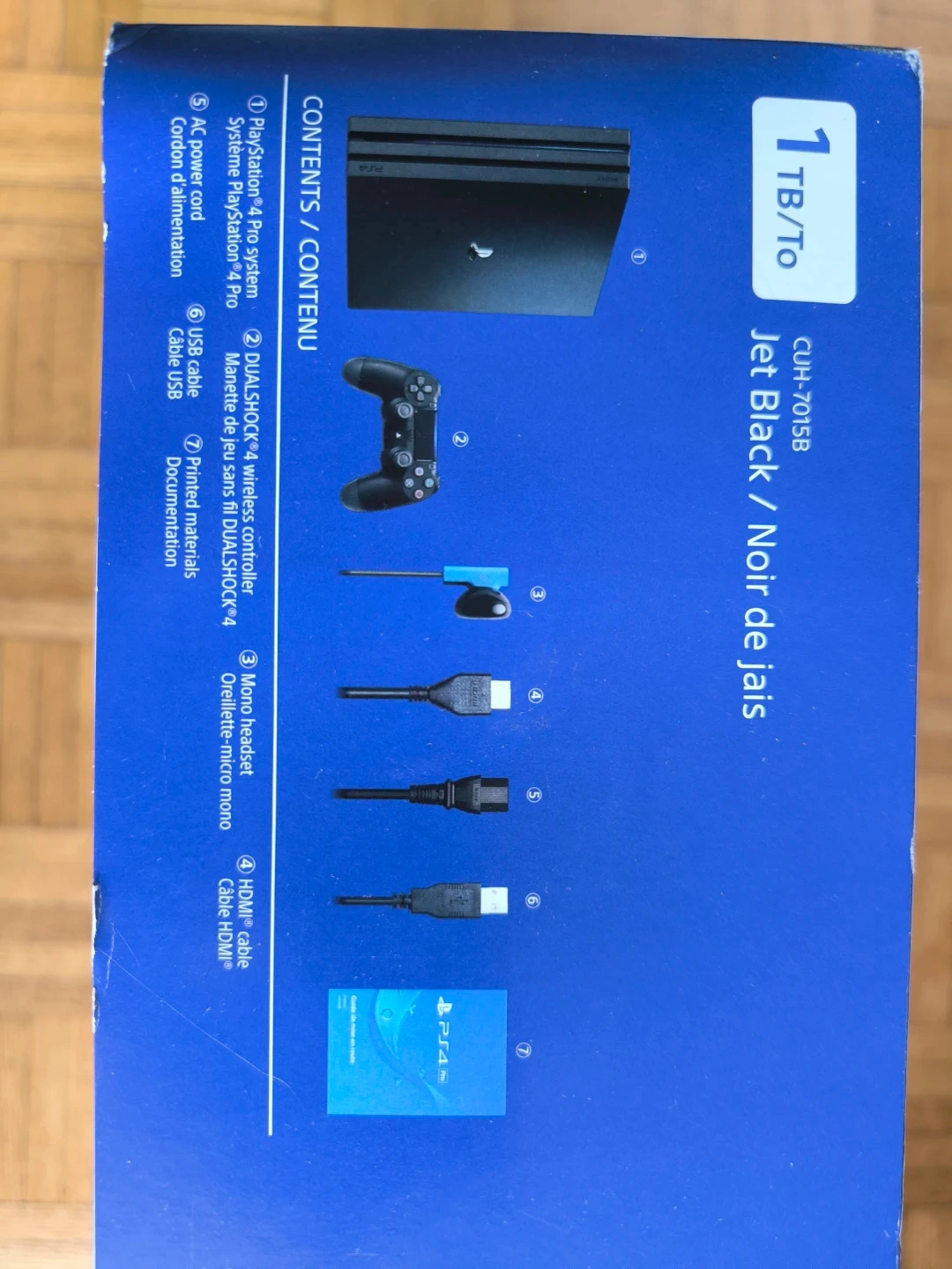PS4 Pro in Jet Black with 1TB of storage. Comes with the original box and all the included components: