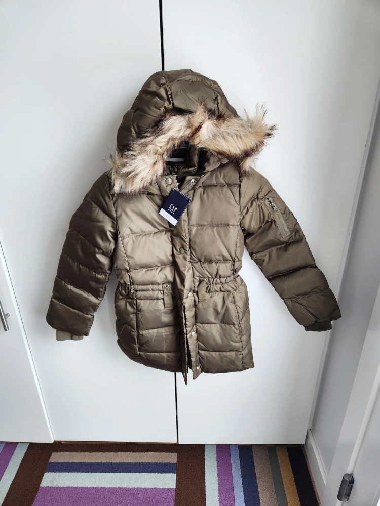Selling a brand new gap elongated down puffer jacket - olive (size M - 7/8 yrs) Puffer with high-performance insulation helps keep you extra-extra cozy through the coldest adventures.