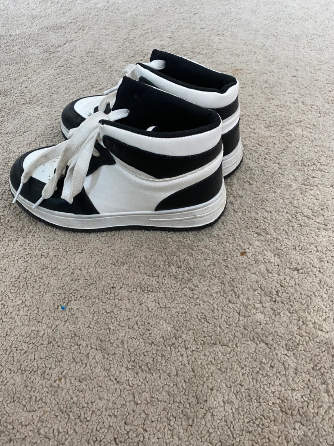 These black and white high-top sneakers are a classic choice for everyday wear. They're made with a synthetic leather material and feature a lace-up closure for a secure fit. The durable rubber sole provides good traction. Great for kids who are always on the move!