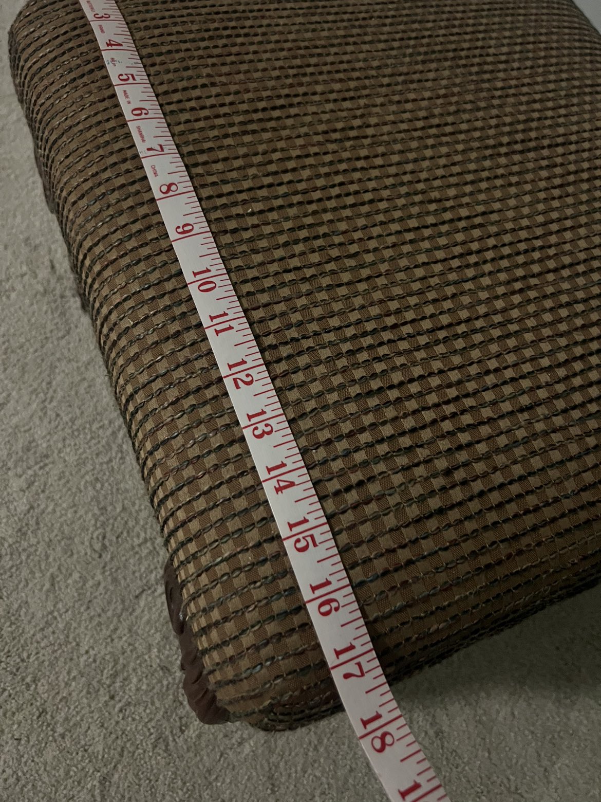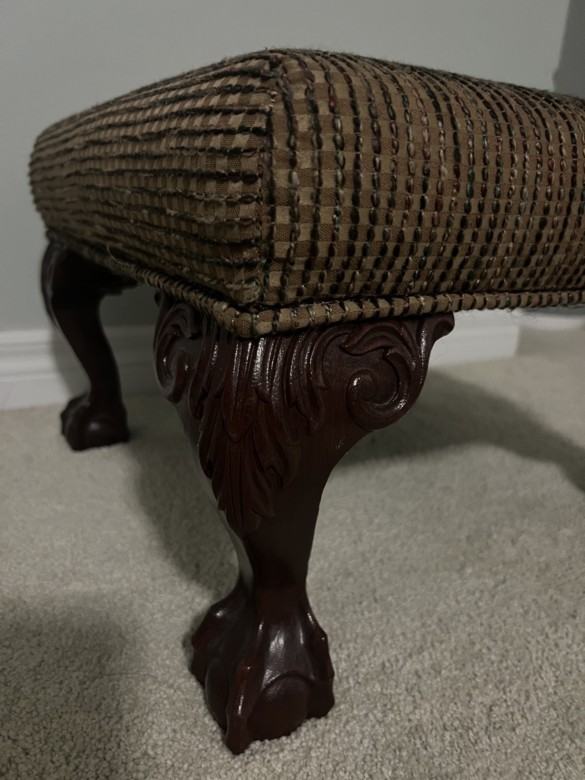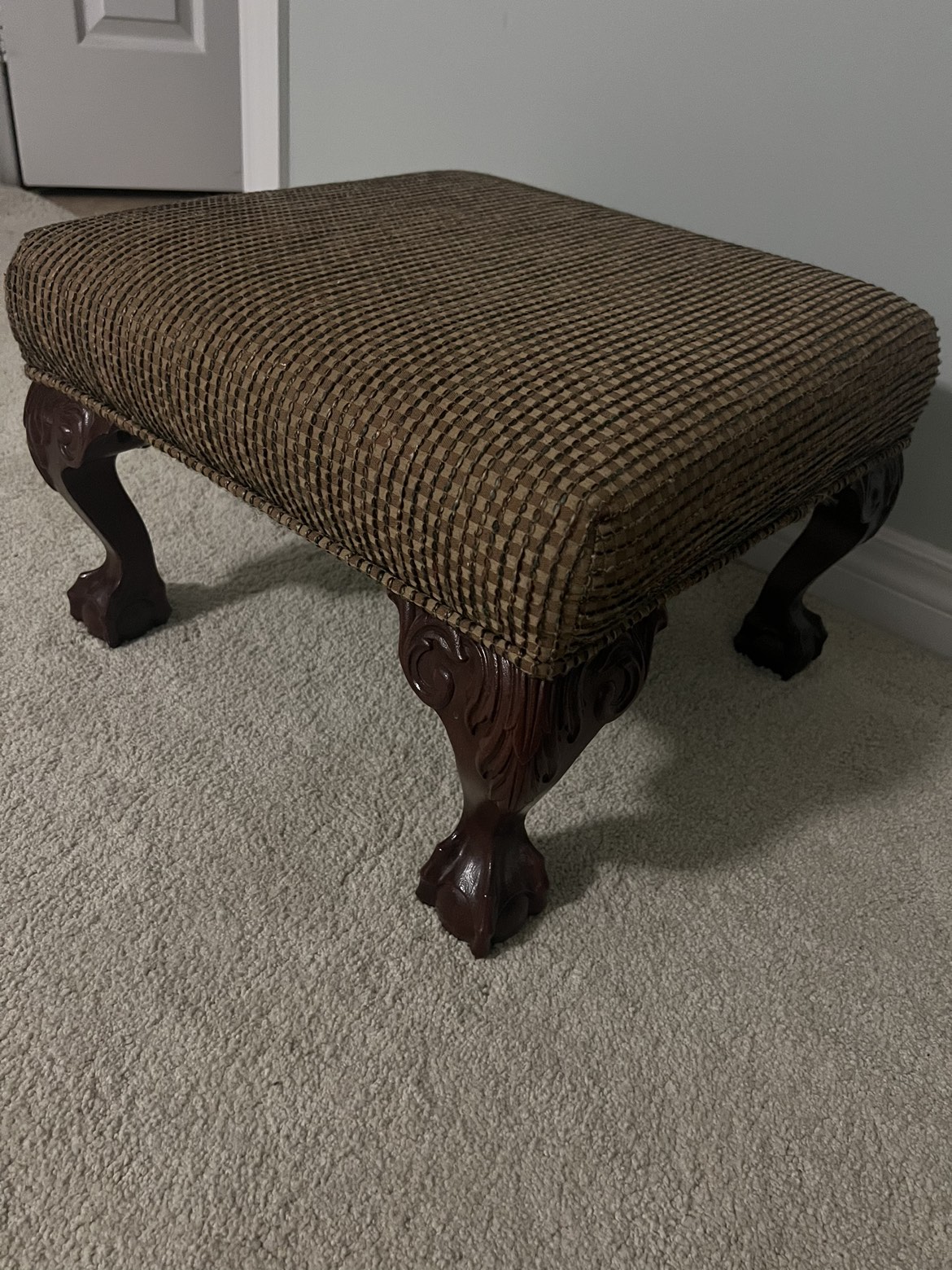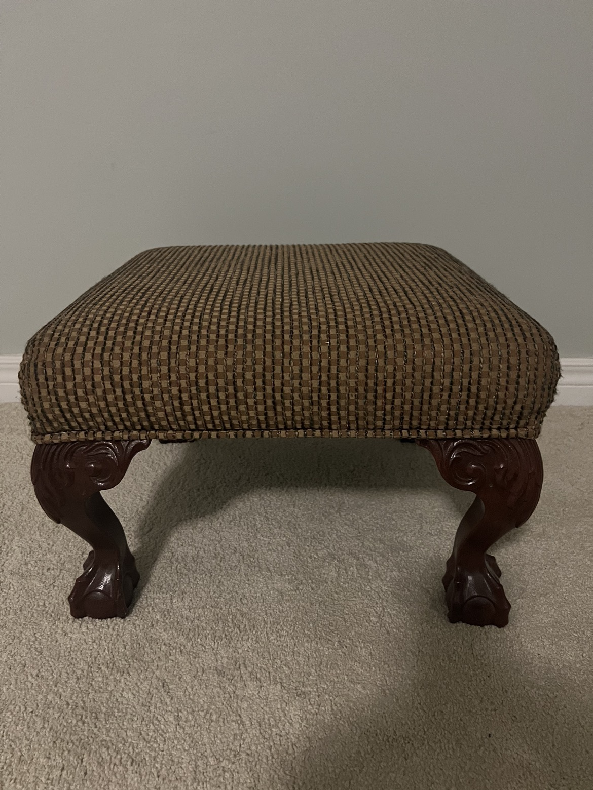 512Barely used footstool that just sits in the corner of our bedroom Dark checkered caramel fabric with multi colours woven through Sturdy claw shaped legs Please visit my other posts Can bundle items for a better price