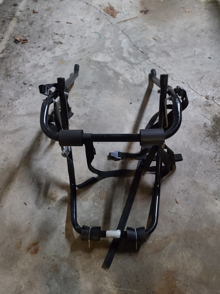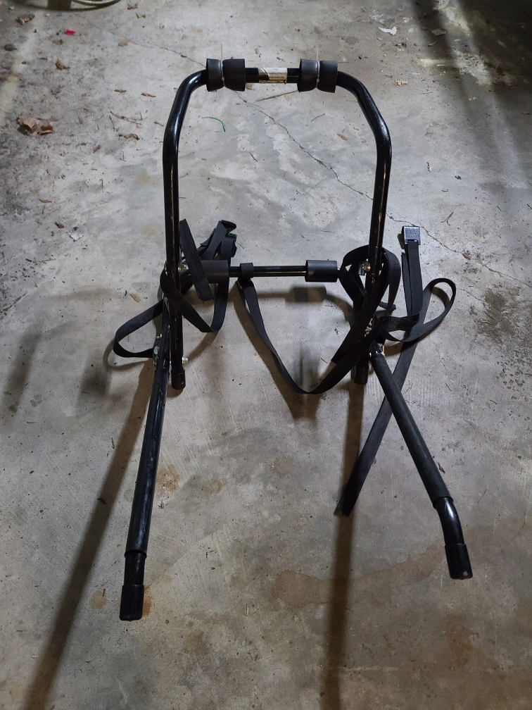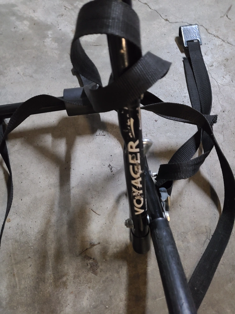 black Voyager bike rack for hatchback car. Straps on rear hatchback. Can hold up to 3 bikes, as I have done. Ideally two is the best.
