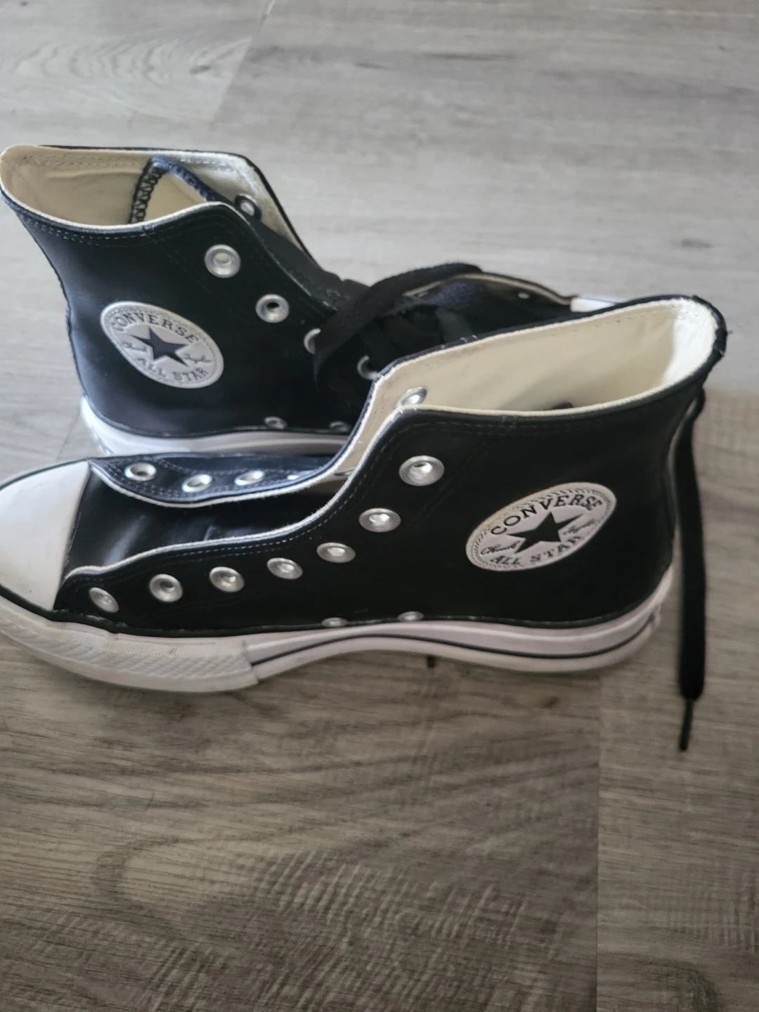 Black Converse Chuck Taylor All Star high top sneakers. Women's size 8 (US), 6 (UK), 39 (EUR), 24.5 (CM). Upper is leather, lining is textile, and the outsole is rubber. These shoes are a classic style! Needs laces