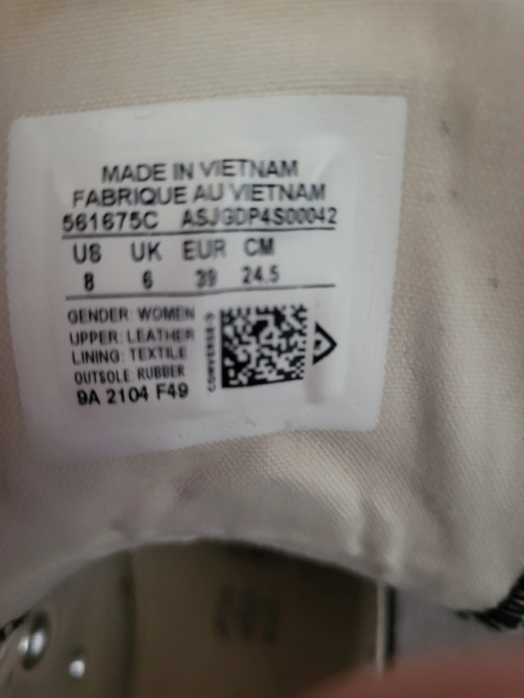 Black Converse Chuck Taylor All Star high top sneakers. Women's size 8 (US), 6 (UK), 39 (EUR), 24.5 (CM). Upper is leather, lining is textile, and the outsole is rubber. These shoes are a classic style! Needs laces