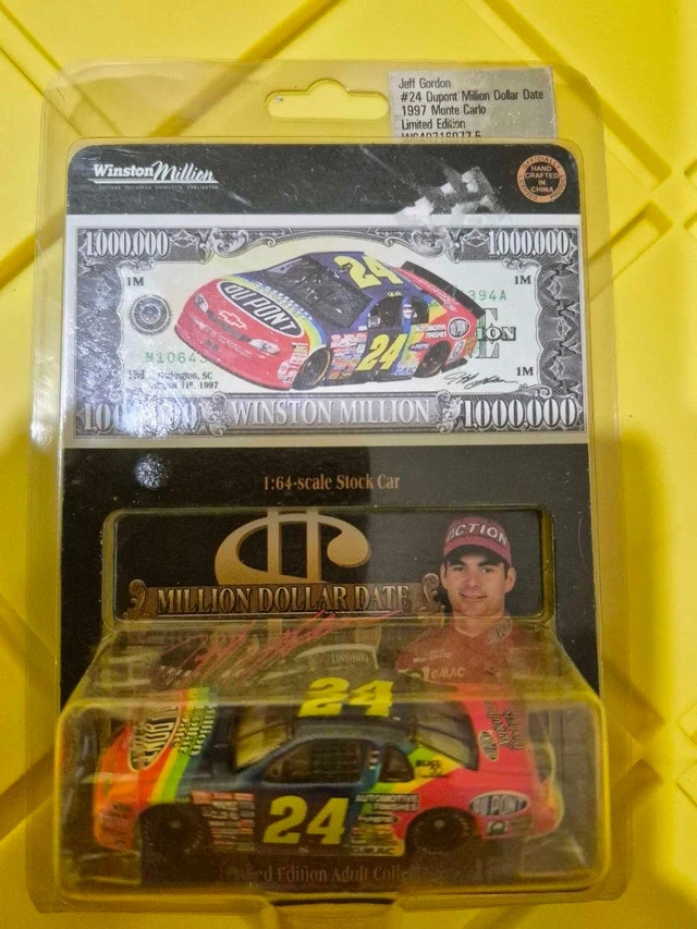 Add a piece of racing history to your collection with this Jeff Gordon #24 Winston Million Dollar Date 1997 Monte Carlo 1:64 scale diecast car! This collectible is still sealed in its original packaging, never opened, making it a pristine find for any NASCAR enthusiast. Own a miniature of the iconic #24 car that once raced around the tracks. Scale: 1:64, Car: #24 Jeff Gordon Winston Million Dollar Date Monte Carlo, Year: 1997, Condition: New, still sealed in original packaging. If you're reading this, the car is still available, waiting for its new home on your display shelf.