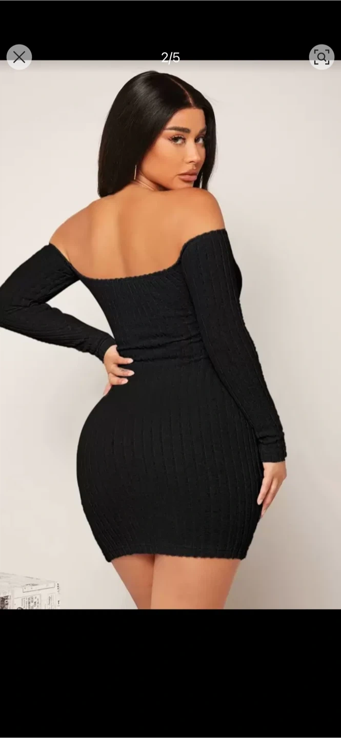 This black mini dress features an off-the-shoulder neckline and long sleeves. It's made from a ribbed knit fabric with a button-up front. Its bodycon fit hugs your curves!