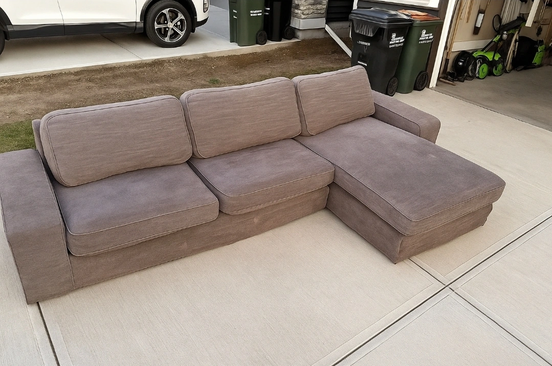 Selling a comfy sectional sofa with a chaise lounge! It's in great condition and perfect for relaxing or entertaining. The colour is a neutral brown/grey, so it will fit in with any decor. There are some signs of wear, but overall it's a great piece of furniture!