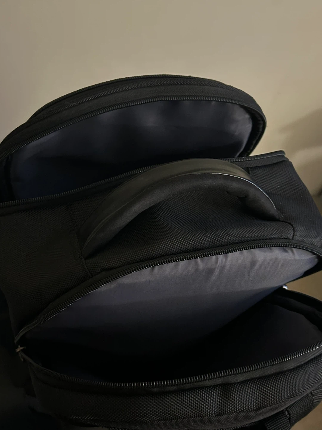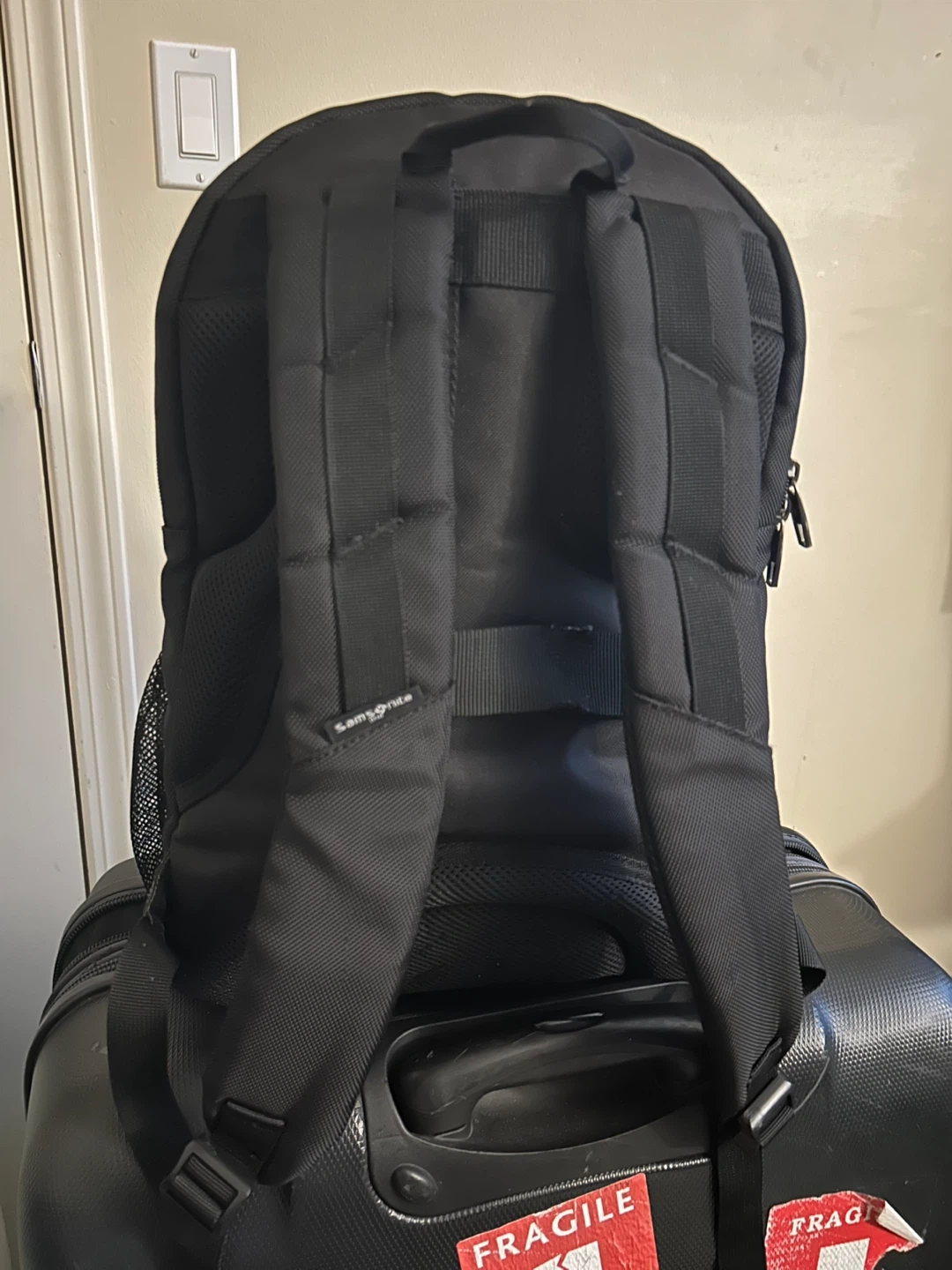 This is a black Samsonite backpack. It's made of very durable fabric and has multiple zippered compartments. It features padded shoulder straps for comfort. It's a great bag for school or travel! Has laptop compartment, big capacity.