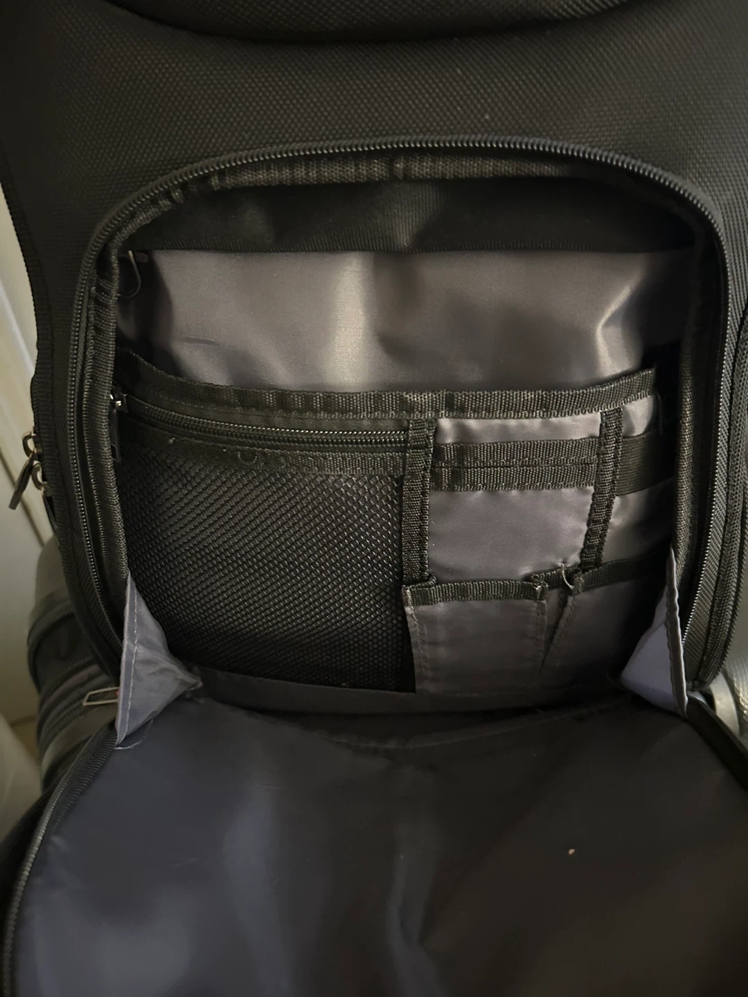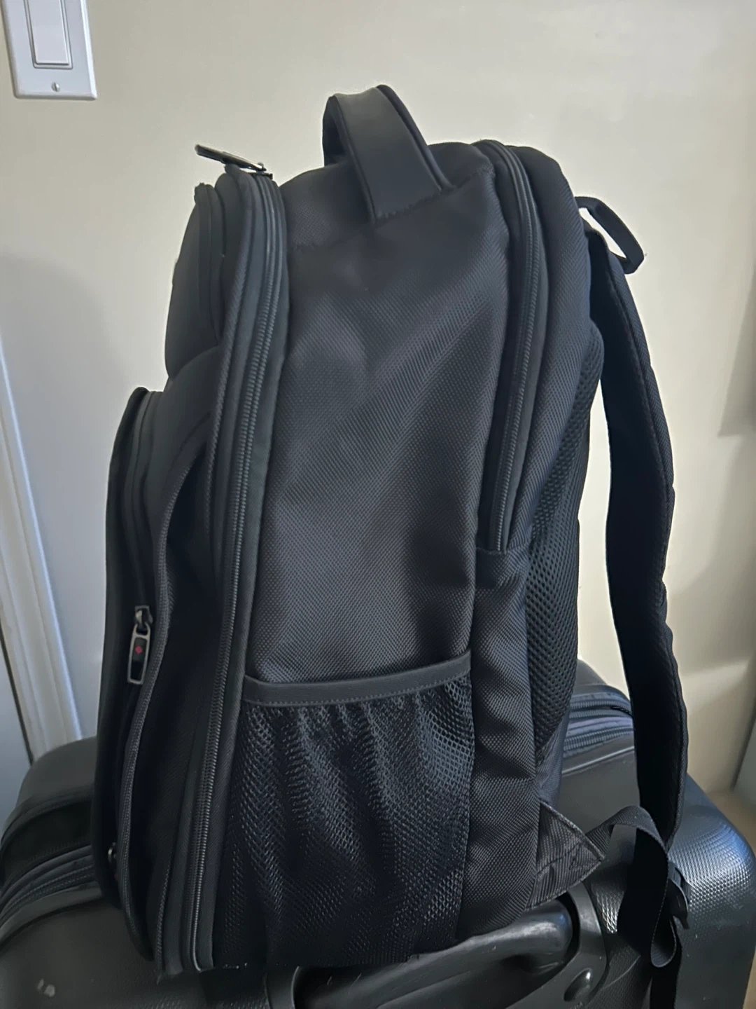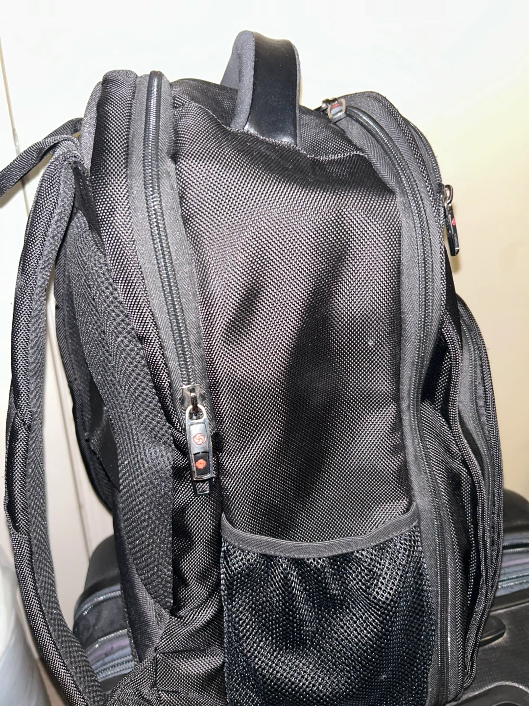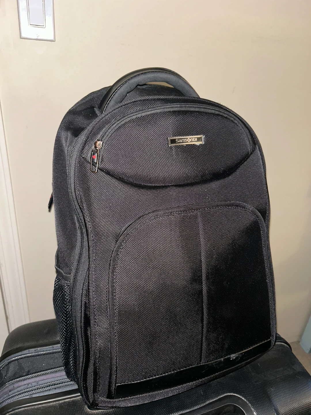 This is a black Samsonite backpack. It's made of very durable fabric and has multiple zippered compartments. It features padded shoulder straps for comfort. It's a great bag for school or travel! Has laptop compartment, big capacity.