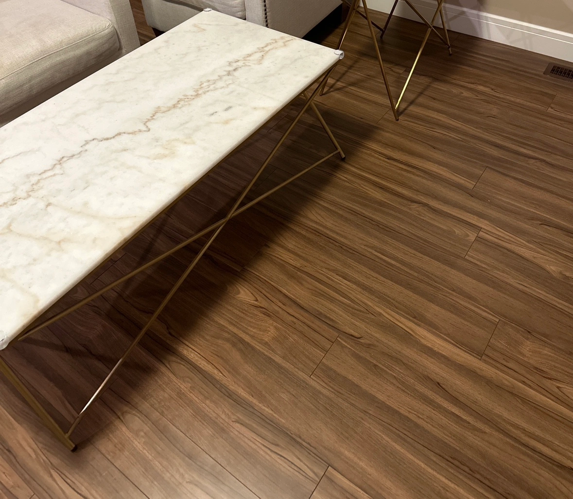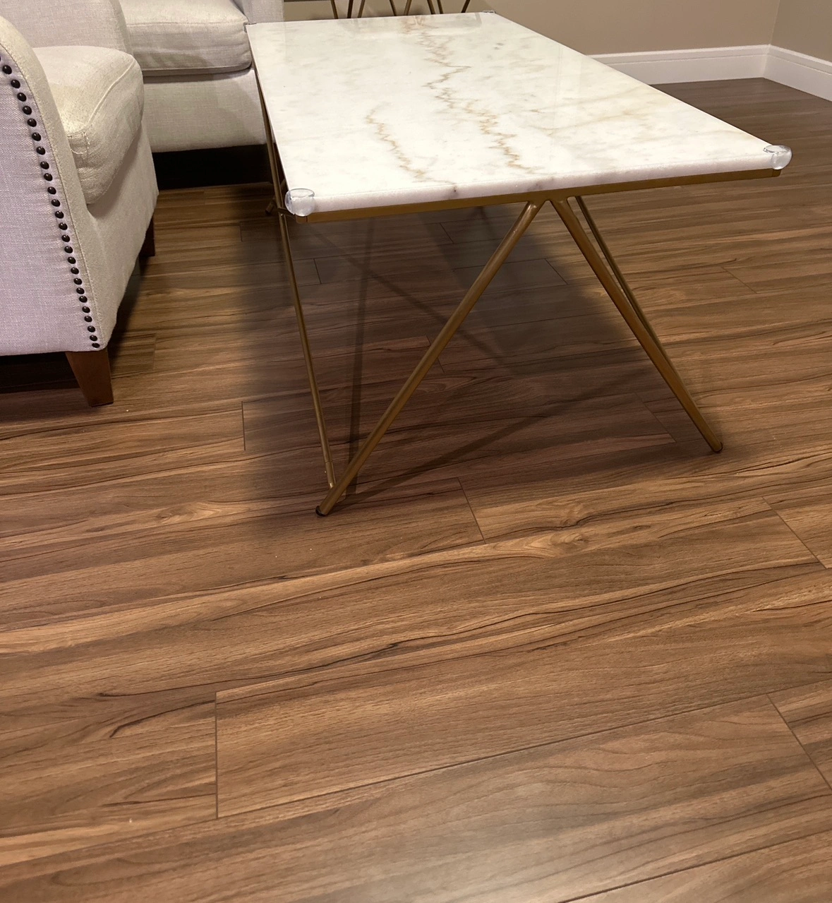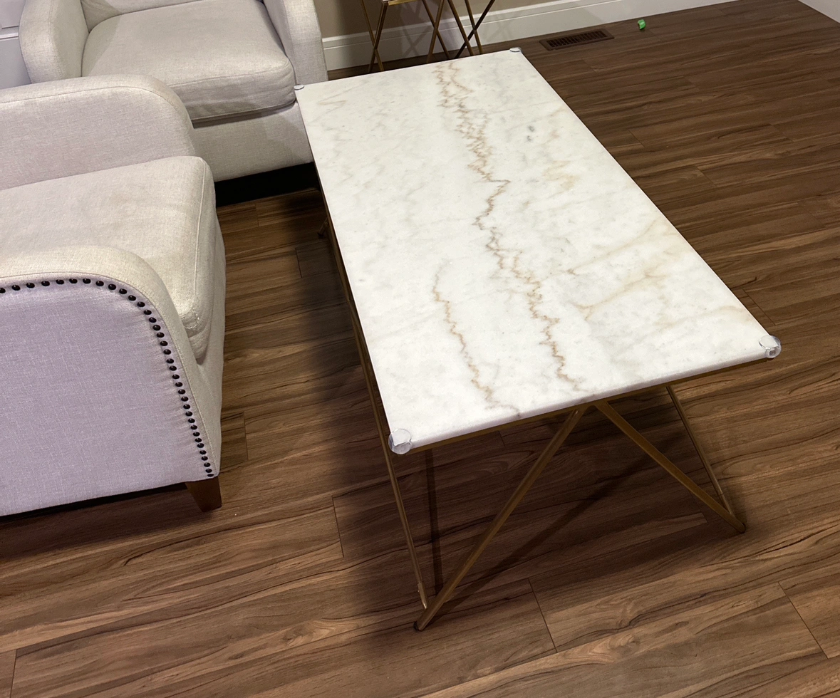 Golden finish, stainless steel legs, marble has sealant on it and its well protected