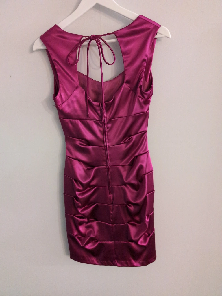 Dress - magenta in satin with pleating all the way down front. Can be worn for any event or party or a night out for dinner. Size extra small.