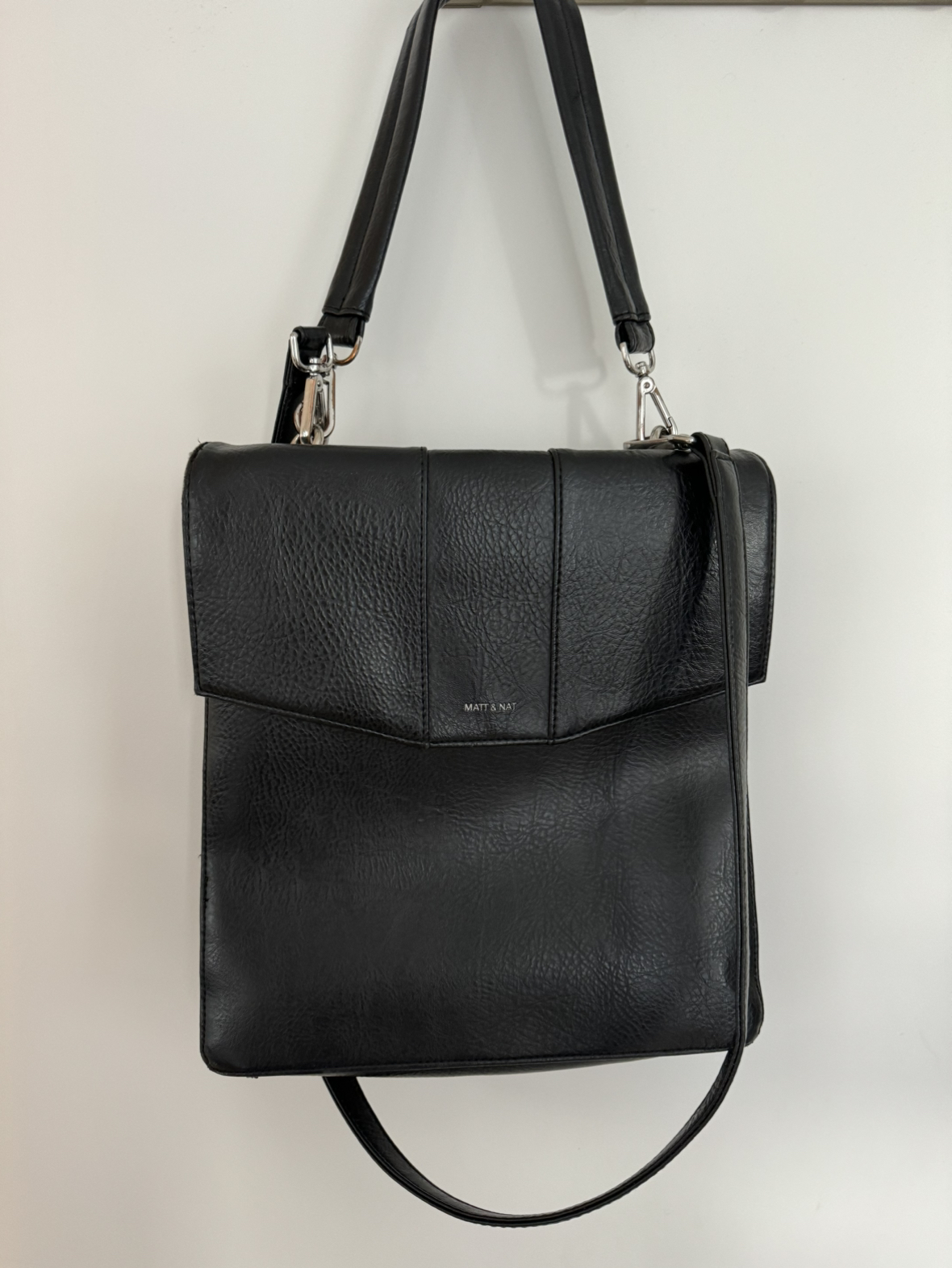 As shown. Fits a 13 inch laptop bag. Rusting on the metal clips.