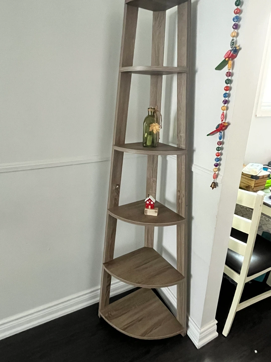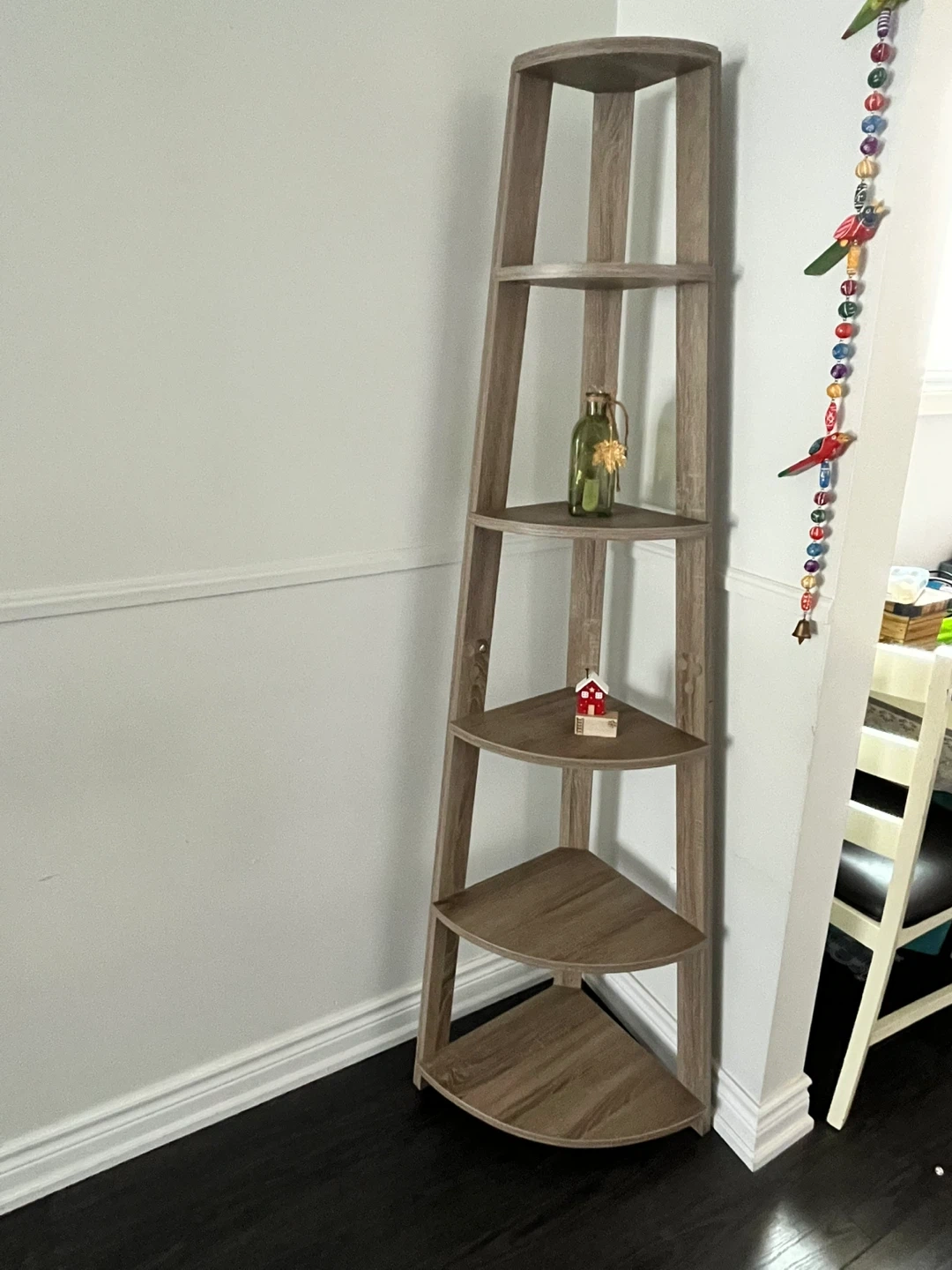 This is a tall, five-tier corner shelving unit. It's made of a wood-look material in a light brown or greyish-brown tone. The shelves are quarter-circle shaped to fit neatly into a corner. It's great for displaying decor or storing small items!